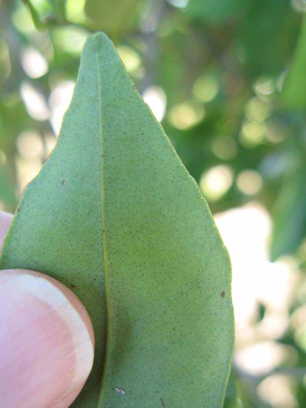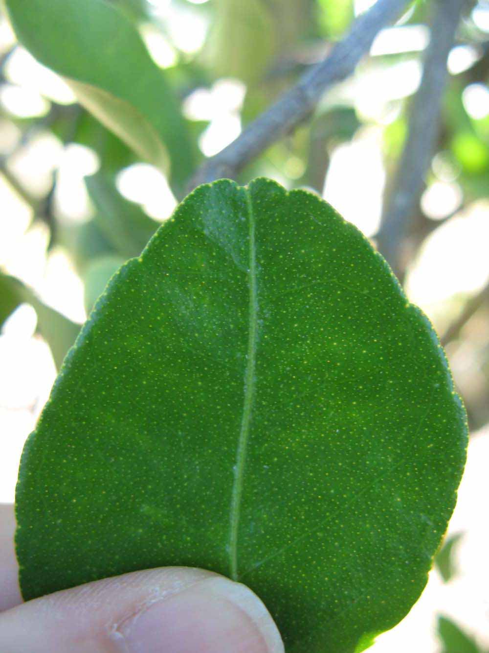 Crown compact or dense, not weeping. First-year twig surface glabrous; second- or third-year twig surface striate; thorns absent or not persistent; prickles absent or not persistent. Petiole glabrous, length short; wings absent, if present, narrow, adjoining the blade. Leaflets one, margin entire, crenate/crenulate or bluntly toothed, shade leaflet blades weakly conduplicate, sun leaflet blades weakly conduplicate. Scent of crushed leaflets mandarin-like. Fruit broader than long; rind yellow (7-10), yellow-orange (11), orange (12), or red-orange (13); rind texture slightly rough (4-5); firmness leathery; navel absent; flesh orange; taste acidic-sweet.