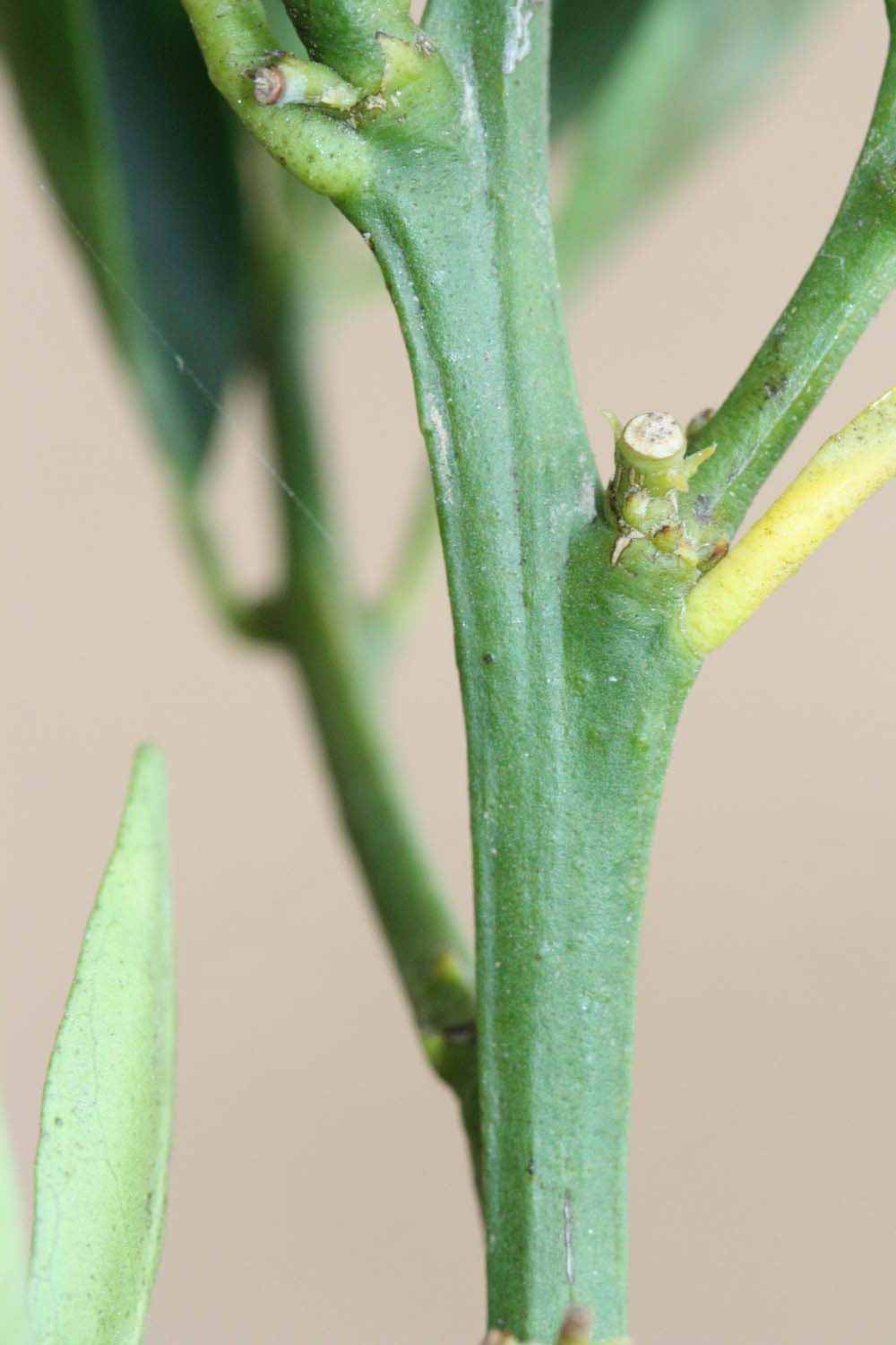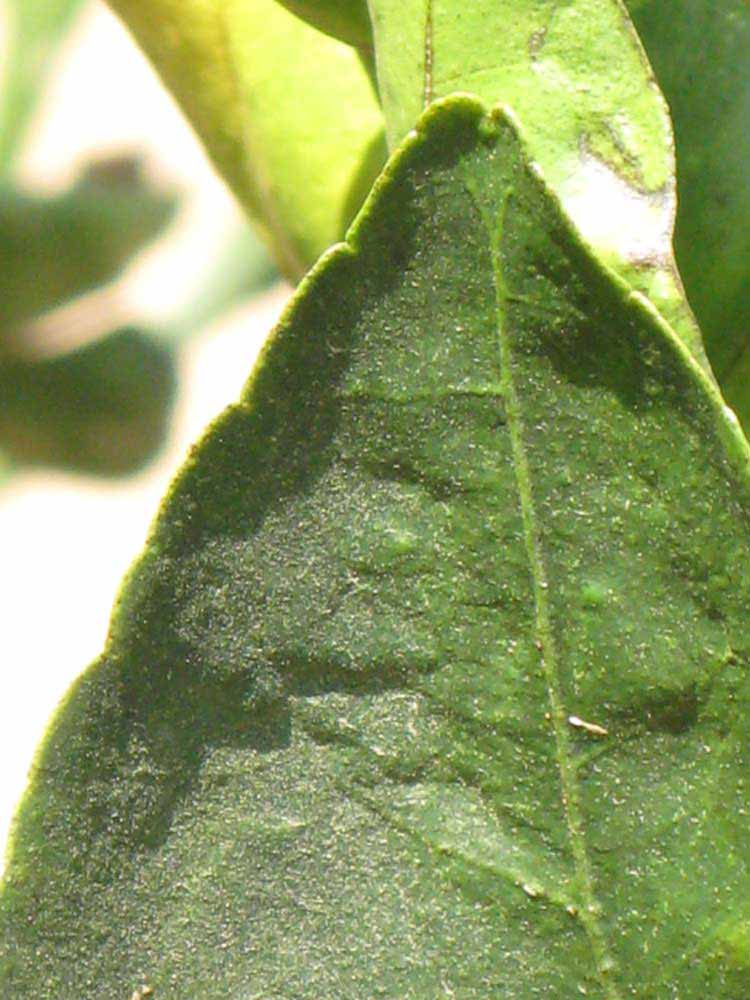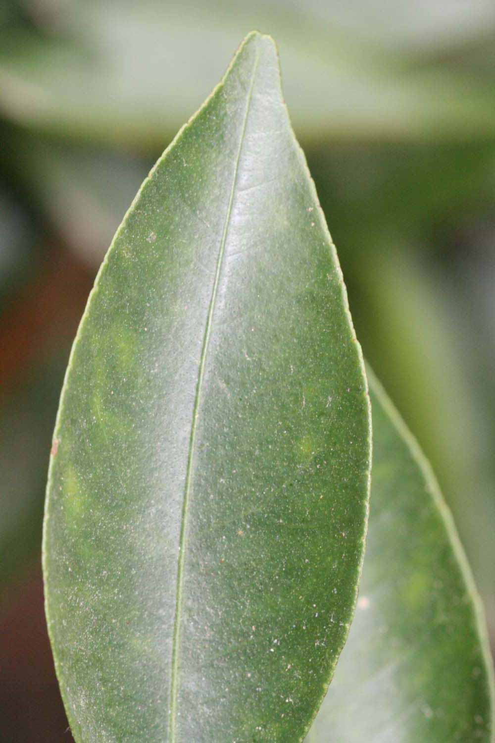 Crown compact or dense, not weeping. First-year twig surface glabrous; second- or third-year twig surface striate; thorns straight; prickles absent or not persistent. Petiole glabrous, length short or medium; wings narrow or medium, adjoining the blade. Leaflets one, margin crenate/crenulate; shade leaflet blades flat or weakly conduplicate, sun leaflet blades weakly or strongly conduplicate. Scent of crushed leaflets mandarin-like. Fruit broader than long; rind yellow (7-10), yellow-orange (11), orange (12), or red-orange (13); rind texture medium rough (6-7) or rough (8); firmness leathery; navel absent; flesh orange; taste acidic-sweet.