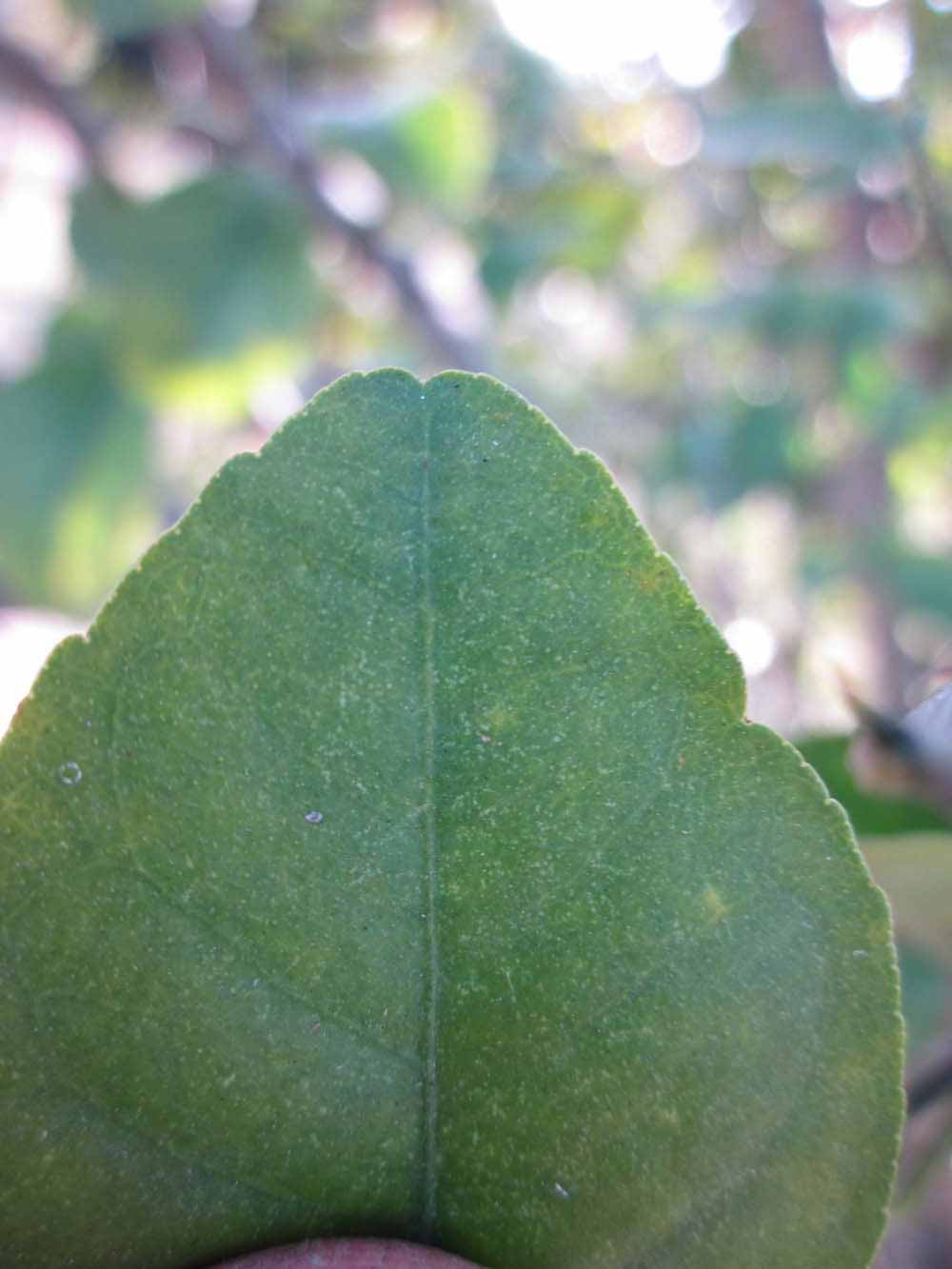 Crown compact or dense, not weeping. First-year twig surface glabrous; second- or third-year twig surface striate; thorns straight; prickles absent or not persistent. Petiole glabrous, length long; wings medium, adjoining the blade. Leaflets one or three, margin bluntly toothed, rachis wings absent, shade leaflet blades flat or weakly conduplicate, sun leaflet blades weakly conduplicate. Leaflets unscented when crushed. Fruit broader than long; rind green-yellow (6), yellow (7-10), yellow-orange (11), or orange (12); rind texture smooth (1-3) or slightly rough (4-5); firmness leathery; navel absent; flesh orange or yellow; taste sour.