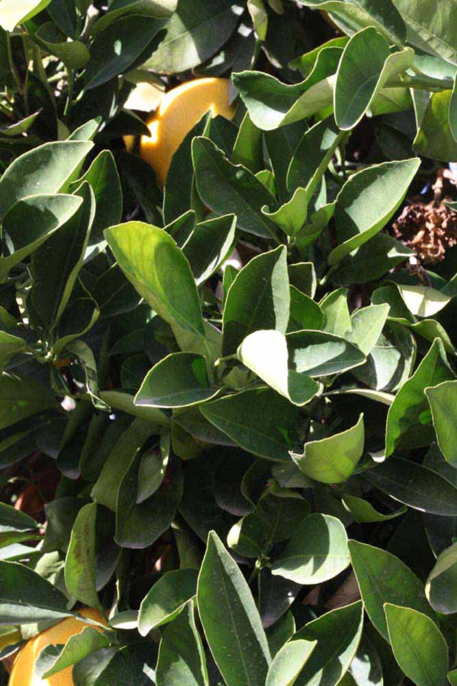 Crown compact or dense, not weeping. First-year twig surface glabrous; second- or third-year twig surface striate; thorns absent or not persistent; prickles absent or not persistent. Petiole glabrous, length medium; wings narrow, adjoining the blade. Leaflets one, margin bluntly toothed, shade leaflet blades weakly conduplicate, sun leaflet blades weakly conduplicate. Scent of crushed leaflets sweetly orange-like. Fruit as broad as long or longer than broad; rind yellow (7-10), yellow-orange (11), orange (12), or red-orange (13); rind texture slightly rough (4-5); firmness leathery; navel present; flesh orange; taste acidic-sweet.
