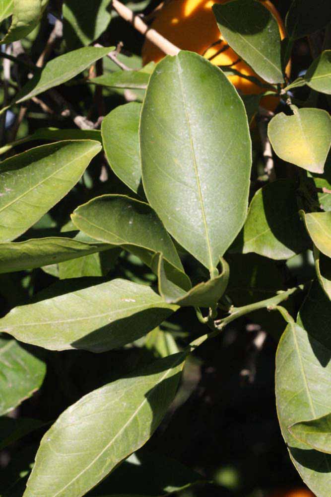 Crown compact or dense, not weeping. First-year twig surface glabrous; second- or third-year twig surface striate; thorns absent or not persistent; prickles absent or not persistent. Petiole glabrous, length medium; wings medium, adjoining the blade. Leaflets one, margin bluntly toothed. shade leaflet blades weakly conduplicate, sun leaflet blades weakly conduplicate. Scent of crushed leaflets sweetly orange-like. Fruit as broad as long or longer than broad; rind yellow-orange (11), orange (12), or red-orange (13); rind texture slightly rough (4-5); firmness leathery; navel present; flesh orange; taste acidic-sweet.