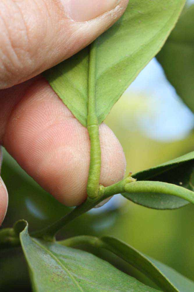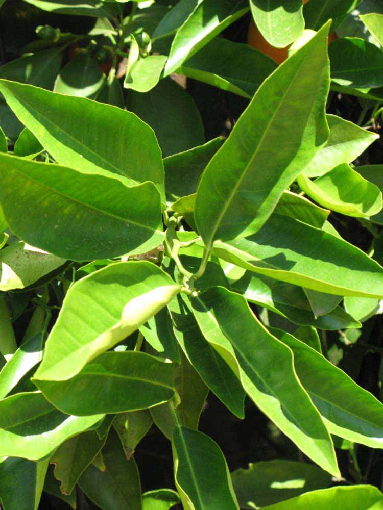 Crown compact or dense, not weeping. First-year twig surface glabrous; second- or third-year twig surface striate; thorns absent or not persistent; prickles absent or not persistent. Petiole glabrous, length short; wings absent, if present, narrow, adjoining the blade. Leaflets one, margin entire or bluntly toothed, shade leaflet blades flat or weakly conduplicate, sun leaflet blades strongly conduplicate. Fruit as broad as long or longer than broad; rind yellow-orange (11), orange (12), or red-orange (13); rind texture slightly rough (4-5); firmness leathery; navel absent; flesh orange; taste acidless-sweet.