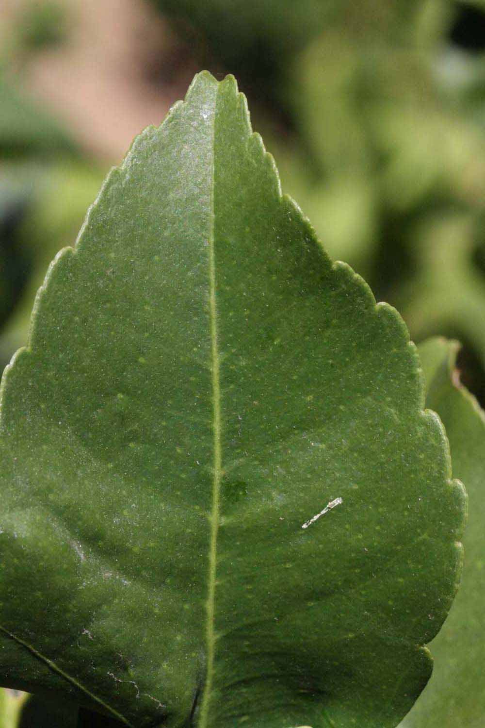 Crown compact or dense, not weeping. First-year twig surface glabrous; second- or third-year twig surface striate; thorns absent or not persistent; prickles absent or not persistent. Petiole glabrous, length short or medium; wings absent or narrow, adjoining the blade or absent. Leaflets one, margin bluntly toothed, shade leaflet blades flat or weakly conduplicate, sun leaflet blades weakly conduplicate. Scent of crushed leaflets freshly lemon-like. Fruit as broad as long or longer than broad; rind green-yellow (6), yellow (7-10), or yellow-orange (11); rind texture slightly rough (4-5); firmness leathery; navel absent; flesh yellow; taste sour.