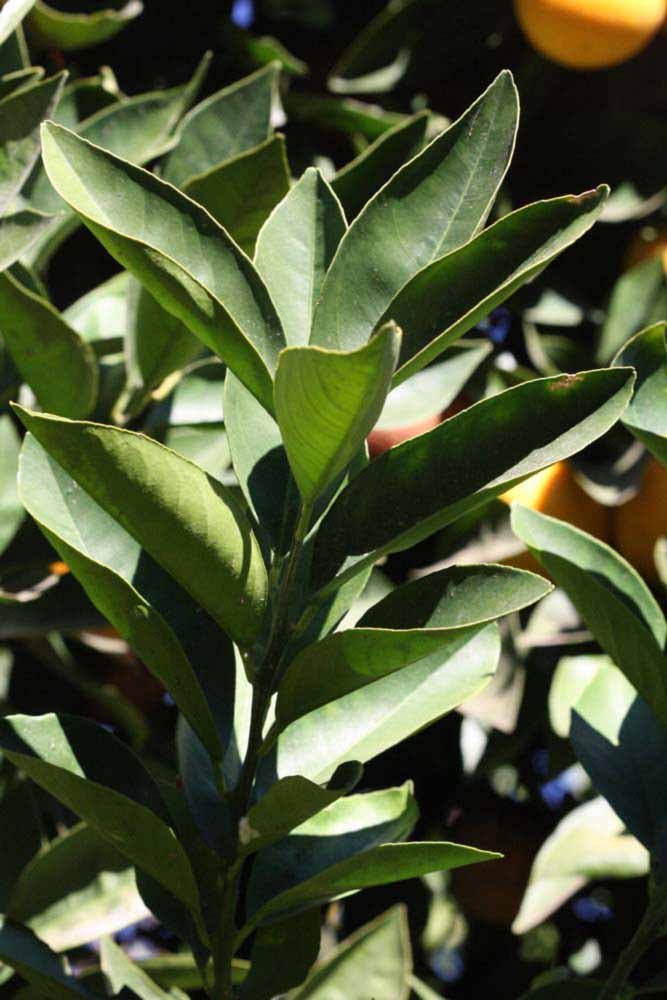 Crown compact or dense, not weeping. First-year twig surface glabrous; second- or third-year twig surface striate; thorns absent or not persistent; prickles absent or not persistent. Petiole glabrous, length medium; wings absent, if present, narrow, adjoining the blade. Leaflets one, margin entire (by misinterpretation) or bluntly toothed, shade leaflet blades flat or weakly conduplicate, sun leaflet blades weakly conduplicate or strongly conduplicate. Scent of crushed leaflets sweetly orange-like. Fruit as broad as long or longer than broad; rind yellow (7-10), yellow-orange (11), orange (12), or red-orange (13); rind texture slightly rough (4-5); firmness leathery; navel absent; flesh orange; taste acidic-sweet.