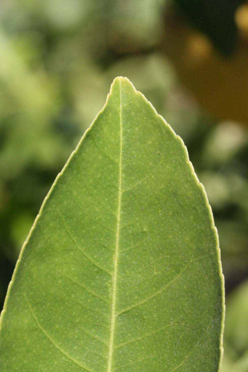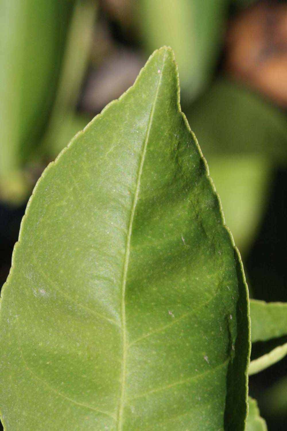Crown compact or dense, not weeping. First-year twig surface glabrous; second- or third-year twig surface striate; thorns absent or not persistent; prickles absent or not persistent. Petiole glabrous, length short; wings absent. Leaflets one, margin bluntly toothed, shade leaflet blades weakly conduplicate, sun leaflet blades weakly conduplicate. Scent of crushed leaflets freshly lemon-like. Fruit broader than long; rind yellow (7-10), yellow-orange (11), or orange (12); rind texture slightly rough (4-5); firmness leathery; navel absent; flesh yellow; taste acidless-sweet.
