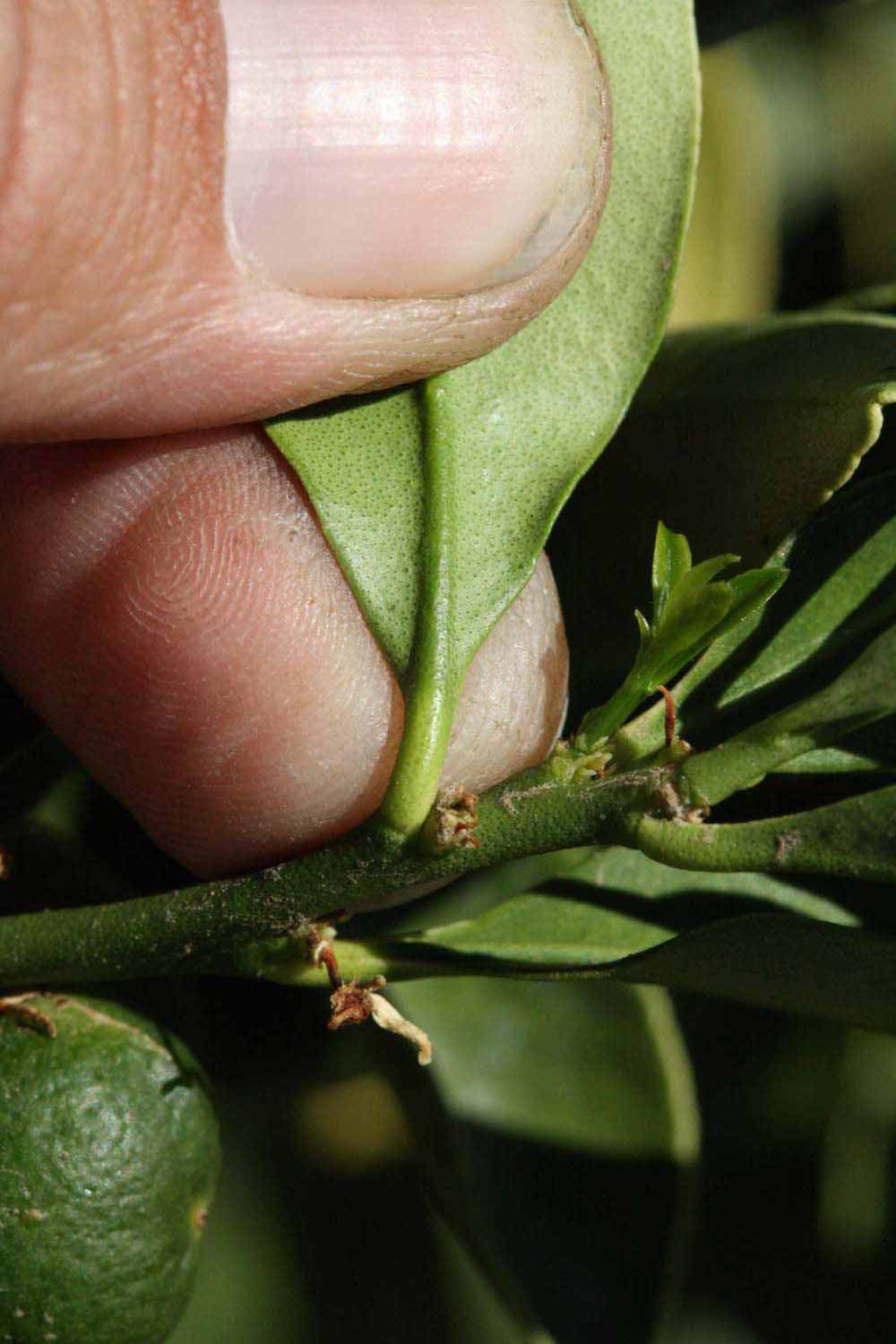 Crown compact or dense, not weeping. First-year twig surface glabrous; second- or third-year twig surface striate; thorns straight; prickles absent or not persistent. Petiole glabrous, length medium; wings narrow, adjoining the blade. Leaflets one, margin entire, crenate/crenulate or bluntly toothed, shade leaflet blades weakly conduplicate. Sun leaflet blades weakly or strongly conduplicate. Scent of leaflets freshly lemon-like. Fruit as broad as long or longer than broad; rind green-yellow (6), yellow (7-10), yellow-orange (11), or orange (12); rind texture smooth (1-3) or slightly rough (4-5); firmness leathery; navel absent; flesh orange or yellow; taste acidic-sweet.