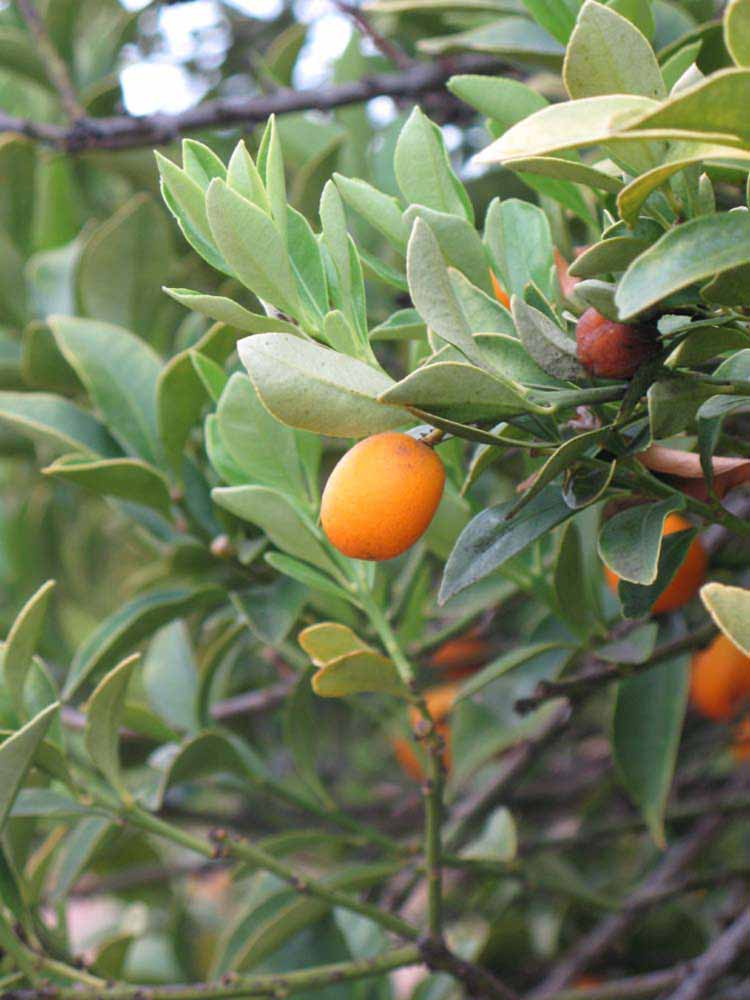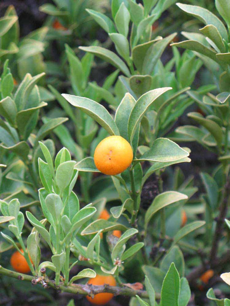 "This species is the Ninpo, Meiwa or Neiha kinkan of Japan. The most distinctive features of this kumquat are the short oblong to round form and relatively large size of the fruit, the more numerous sections (commonly seven), the very thick and sweet rind and comparatively sweet flavor, and the low seed content (many fruits are seedless).