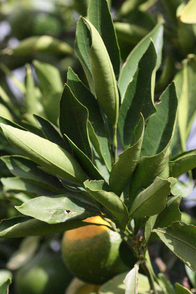 Crown compact or dense, not weeping. First-year twig surface glabrous; second- or third-year twig surface striate; thorns absent or not persistent; prickles absent or not persistent. Petiole glabrous, length medium; wings narrow, adjoining the blade. Leaflets one, margin bluntly toothed, shade leaflet blades weakly conduplicate, sun leaflet blades weakly or strongly conduplicate. Scent of crushed leaflets mandarin-like. Fruit broader than long, as broad as long, or longer than broad; rind yellow-orange (11), orange (12), or red-orange (13); rind texture slightly rough (4-5); firmness leathery; navel absent; flesh orange; taste acidic-sweet.