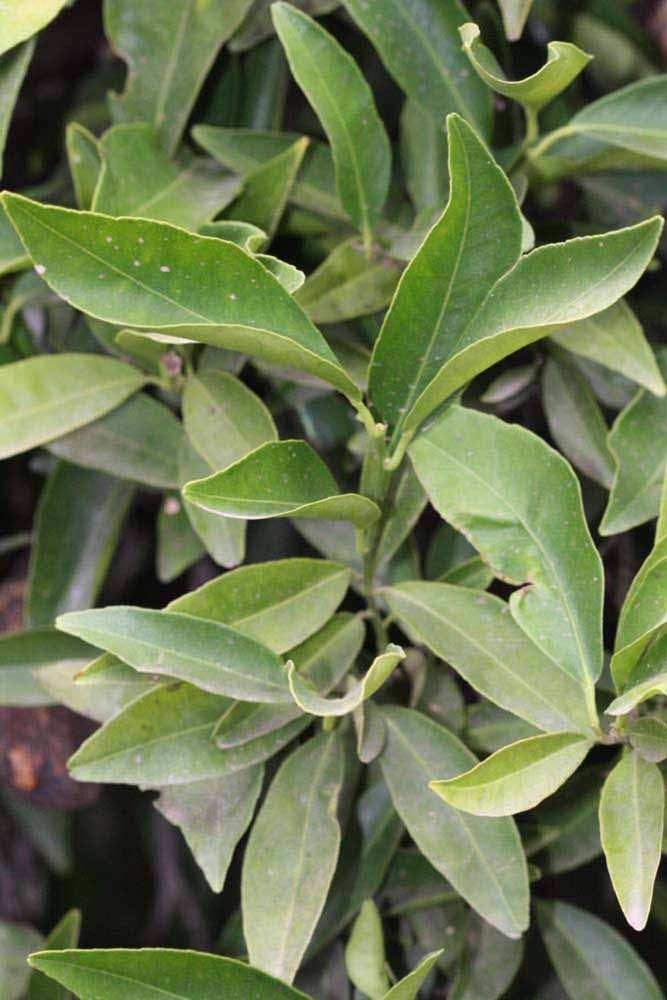 Crown compact or dense, not weeping. First-year twig surface glabrous; second- or third-year twig surface striate; thorns absent or not persistent; prickles absent or not persistent. Petiole glabrous, length short; wings absent, if present, narrow, adjoining the blade. Leaflets one, margin bluntly toothed, shade leaflet blades weakly conduplicate, sun leaflet blades weakly or strongly conduplicate. Scent of crushed leaflets mandarin-like. Fruit broader than long; rind yellow-orange (11), orange (12), or red-orange (13); rind texture smooth (1-3) or slightly rough (4-5); firmness leathery; navel absent; flesh orange; taste acidic-sweet.