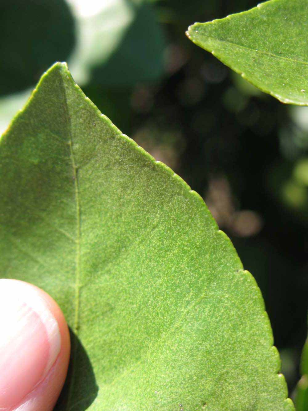 Crown compact or dense, not weeping. First-year twig surface glabrous; second- or third-year twig surface striate; thorns absent or not persistent; prickles absent or not persistent. Petiole glabrous, length medium; wings wide, tucking beneath blade. Leaflets one, margin crenate/crenulate or bluntly toothed, shade leaflet blades flat or weakly conduplicate, sun leaflet blades flat or weakly conduplicate. Leaflets not scented when crushed. Fruit broader than long, as broad as long, or longer than broad; rind green-yellow (6), yellow (7-10), yellow-orange (11), or orange (12); rind texture medium rough (6-7); firmness leathery; navel present; flesh yellow; taste grapefruit-like.
