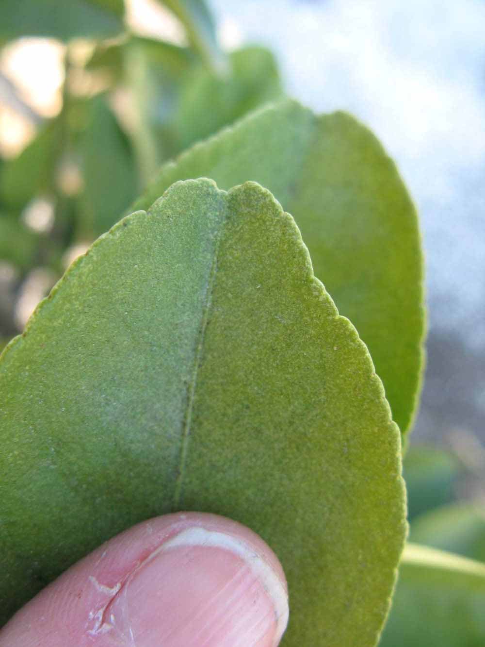 Crown compact or dense, not weeping. First-year twig surface glabrous; second- or third-year twig surface striate; thorns absent or not persistent; prickles absent or not persistent. Petiole glabrous, length medium; wings narrow, adjoining the blade. Leaflets one, margin bluntly toothed, shade leaflet blades weakly conduplicate, sun leaflet blades weakly conduplicate. Scent of crushed leaflets sweetly orange-like. Fruit as broad as long or longer than broad; rind yellow (7-10), yellow-orange (11), orange (12), or red-orange (13); rind texture smooth (1-3), slightly rough (4-5), or medium rough (6-7); firmness leathery; navel present; flesh orange; taste acidic-sweet.
