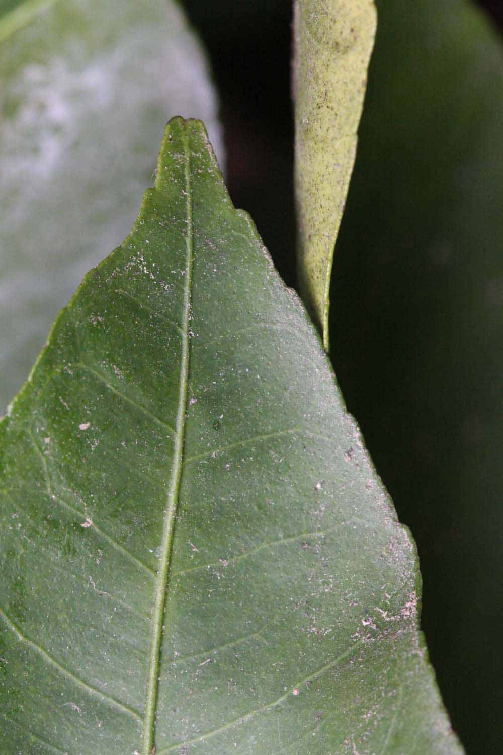 Crown compact or dense, not weeping. First-year twig surface glabrous; second- or third-year twig surface striate; thorns absent or not persistent; prickles absent or not persistent. Petiole glabrous, length short, medium or long; wings narrow, adjoining the blade. Leaflets one, margin bluntly toothed, shade leaflet blades flat or weakly conduplicate, sun leaflet blades weakly or strongly conduplicate. Scent of crushed leaflets mandarin-like. Fruit as broad as long or longer than broad; rind yellow-orange (11), orange (12), or red-orange (13); rind texture slightly rough (4-5); firmness leathery; navel absent; flesh orange; taste acidic-sweet.