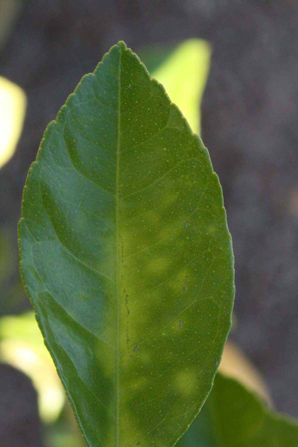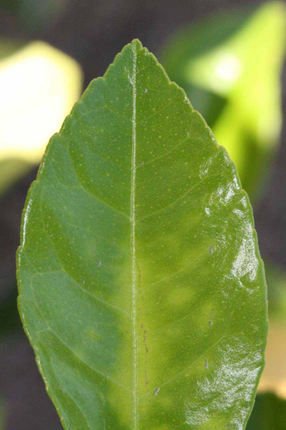 Crown compact or dense, not weeping. First-year twig surface glabrous; second- or third-year twig surface striate; thorns absent or not persistent; prickles absent or not persistent. Petiole glabrous; length short or medium; wings absent. Leaflets one, margin bluntly toothed, shade leaflet blades weakly conduplicate, sun leaflet blades flat or weakly conduplicate. Scent of crushed leaflets freshly lemon-like. Fruit broader than long, as broad as long, or longer than broad; rind green-yellow (6), yellow (7-10), yellow-orange (11), orange (12), or red-orange (13); rind texture slightly rough (4-5), medium rough (6-7), or rough (8); firmness leathery; navel absent; flesh yellow; taste sour.
