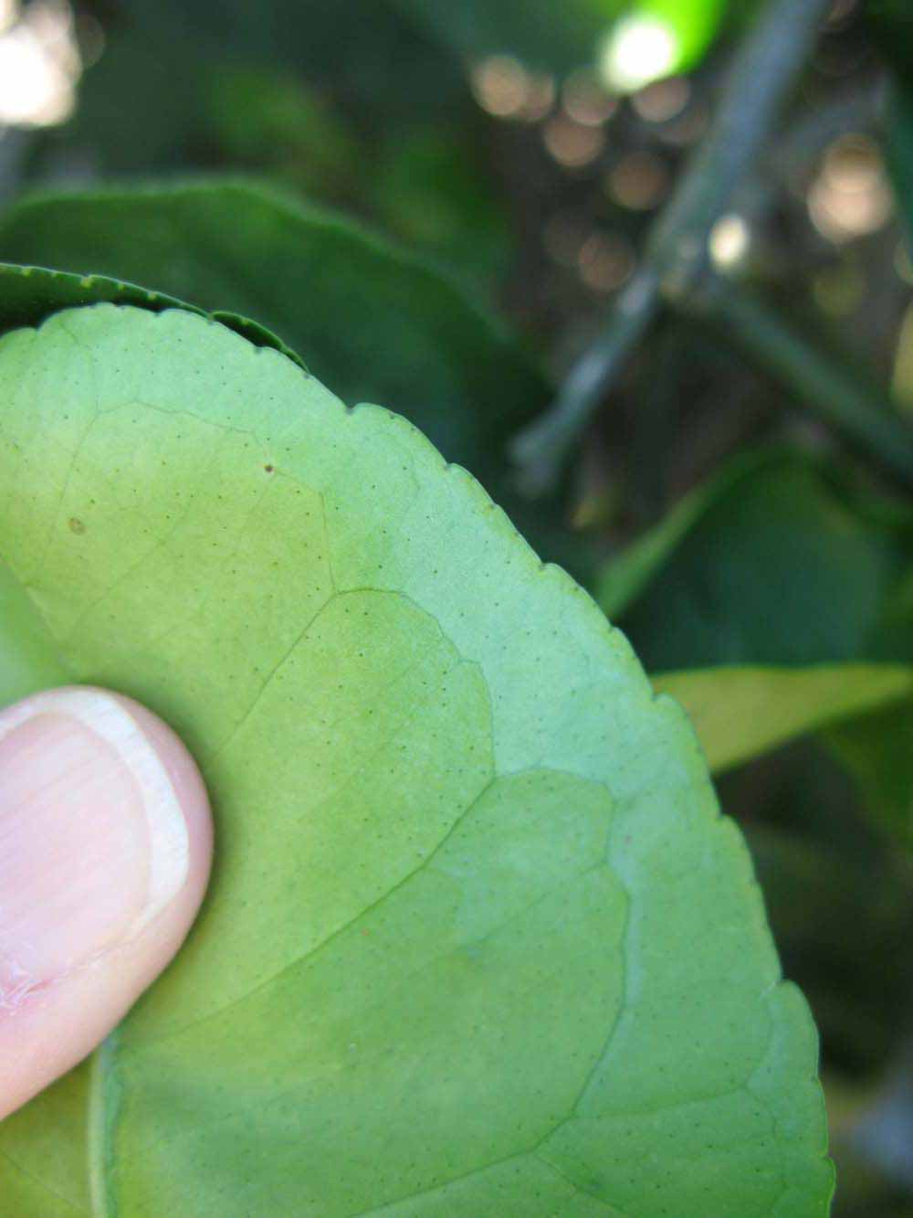 Crown compact or dense, not weeping. First-year twig surface glabrous; second- or third-year twig surface striate; thorns straight; prickles absent or not persistent. Petiole glabrous, length short; wings absent. Leaflets one, margin bluntly toothed, shade leaflet blades weakly conduplicate, sun leaflet blades weakly conduplicate. Scent of crushed leaflets freshly lemon-like. Fruit broader than long, as broad as long, or longer than broad; rind green-yellow (6), yellow (7-10), or yellow-orange (11); rind texture slightly rough (4-5) or medium rough (6-7); firmness leathery; navel absent; flesh yellow; taste sour.