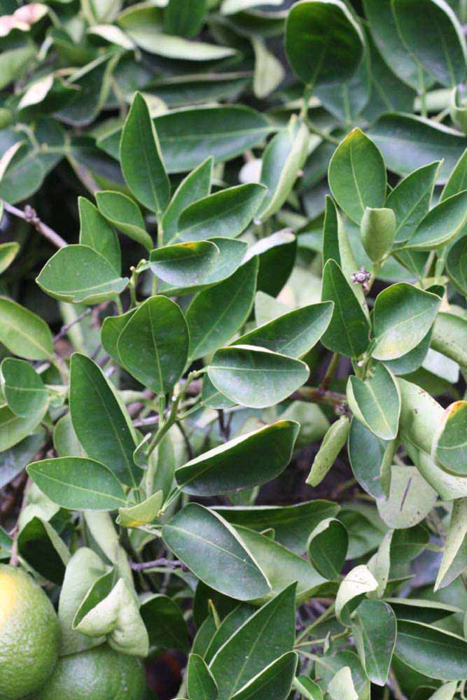 Crown compact or dense, not weeping. First-year twig surface glabrous; second- or third-year twig surface striate; thorns absent or not persistent; prickles absent or not persistent. Petiole glabrous, length medium; wings narrow or medium, adjoining the blade. Leaflets one, margin bluntly toothed, shade leaflet blades weakly or strongly conduplicate, sun leaflet blades weakly or strongly conduplicate. Scent of crushed leaflets mandarin-like. Fruit broader than long, as broad as long, or longer than broad; rind yellow (7-10), yellow-orange (11), or orange (12); rind texture smooth (1-3) or slightly rough (4-5); firmness leathery; navel absent or present; flesh orange; taste acidic-sweet.