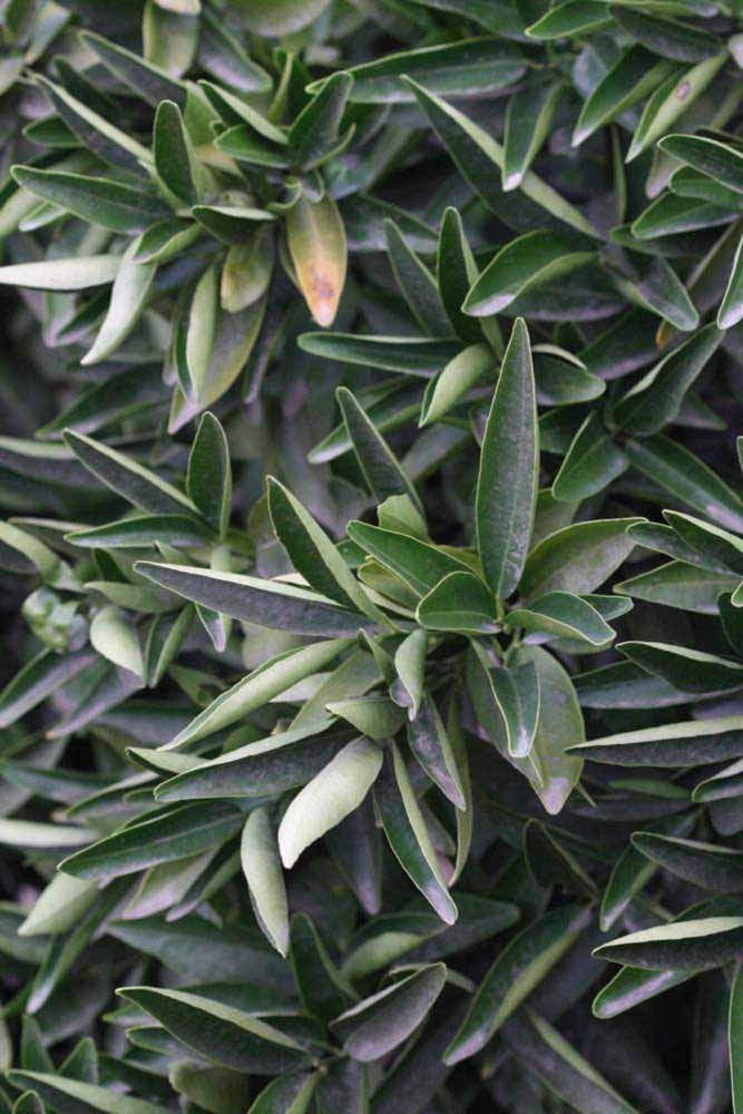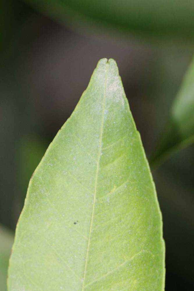 Crown compact or dense, not weeping. First-year twig surface glabrous; second- or third-year twig surface striate; thorns absent or not persistent; prickles absent or not persistent. Petiole glabrous, length short; wings narrow, adjoining the blade. Leaflets one, margin bluntly toothed, shade leaflet blades weakly conduplicate, sun leaflet blades weakly or strongly conduplicate. Scent of crushed leaflets mandarin-like. Fruit broader than long; rind yellow (7-10), yellow-orange (11), orange (12), or red-orange (13); rind texture smooth (1-3) or slightly rough (4-5); firmness leathery; navel absent; flesh orange; taste acidic-sweet.