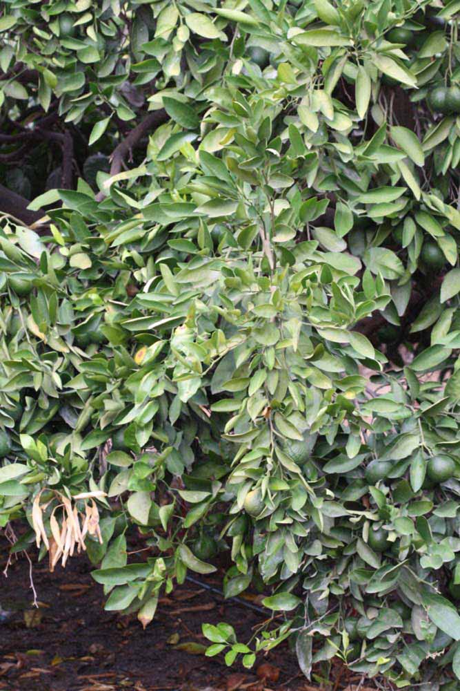Crown compact or dense, not weeping. First-year twig surface glabrous; second- or third year twig surface striate; thorns absent or not persistent; prickles absent or not persistent. Petiole glabrous, length short or medium; wings narrow, adjoining the blade. Leaflets one, margin bluntly toothed, shade leaflet blades flat or weakly conduplicate, sun leaflet blades weakly conduplicate. Scent of crushed leaflets mandarin-like. Fruit broader than long; rind yellow (7-10), yellow-orange (11), or orange (12); rind texture slightly rough (4-5) or medium rough (6-7); firmness leathery; navel absent; flesh orange; taste acidic-sweet.