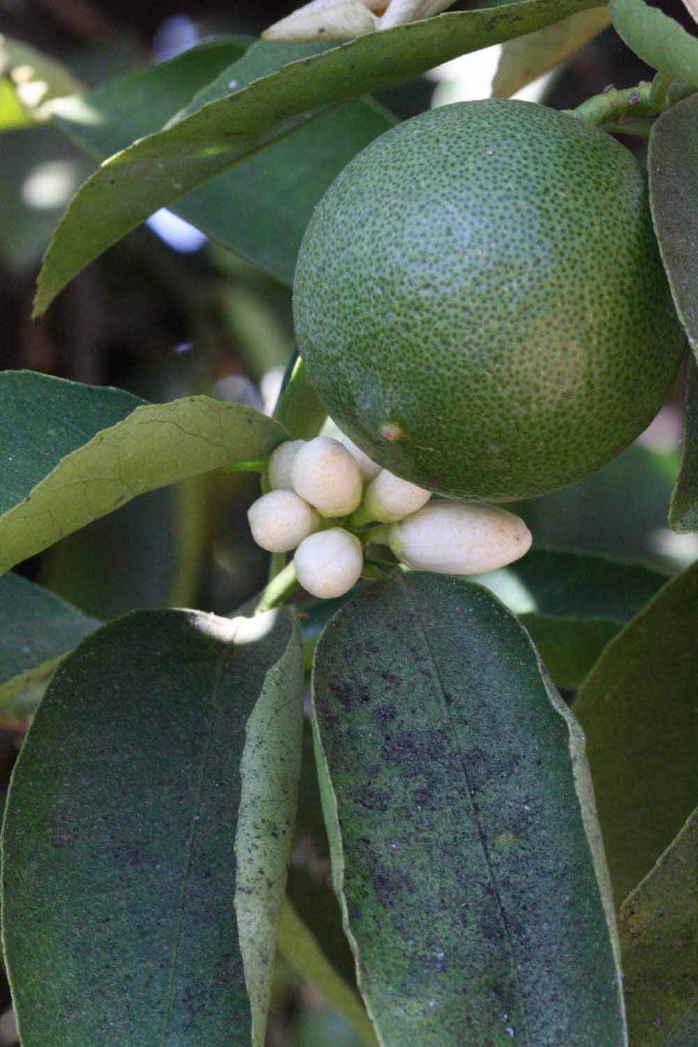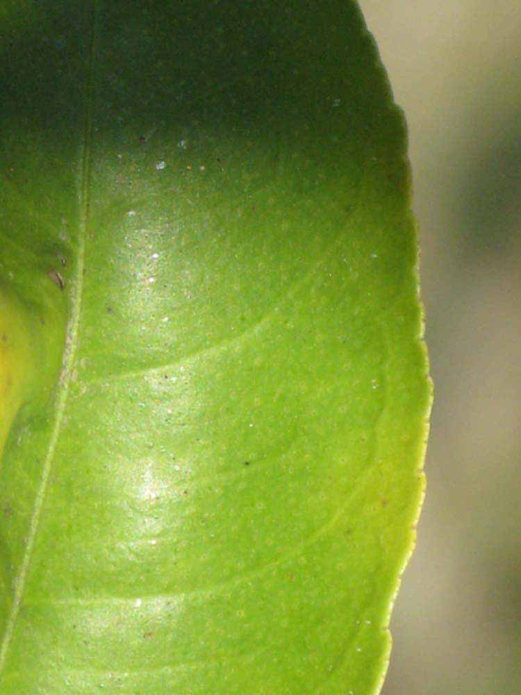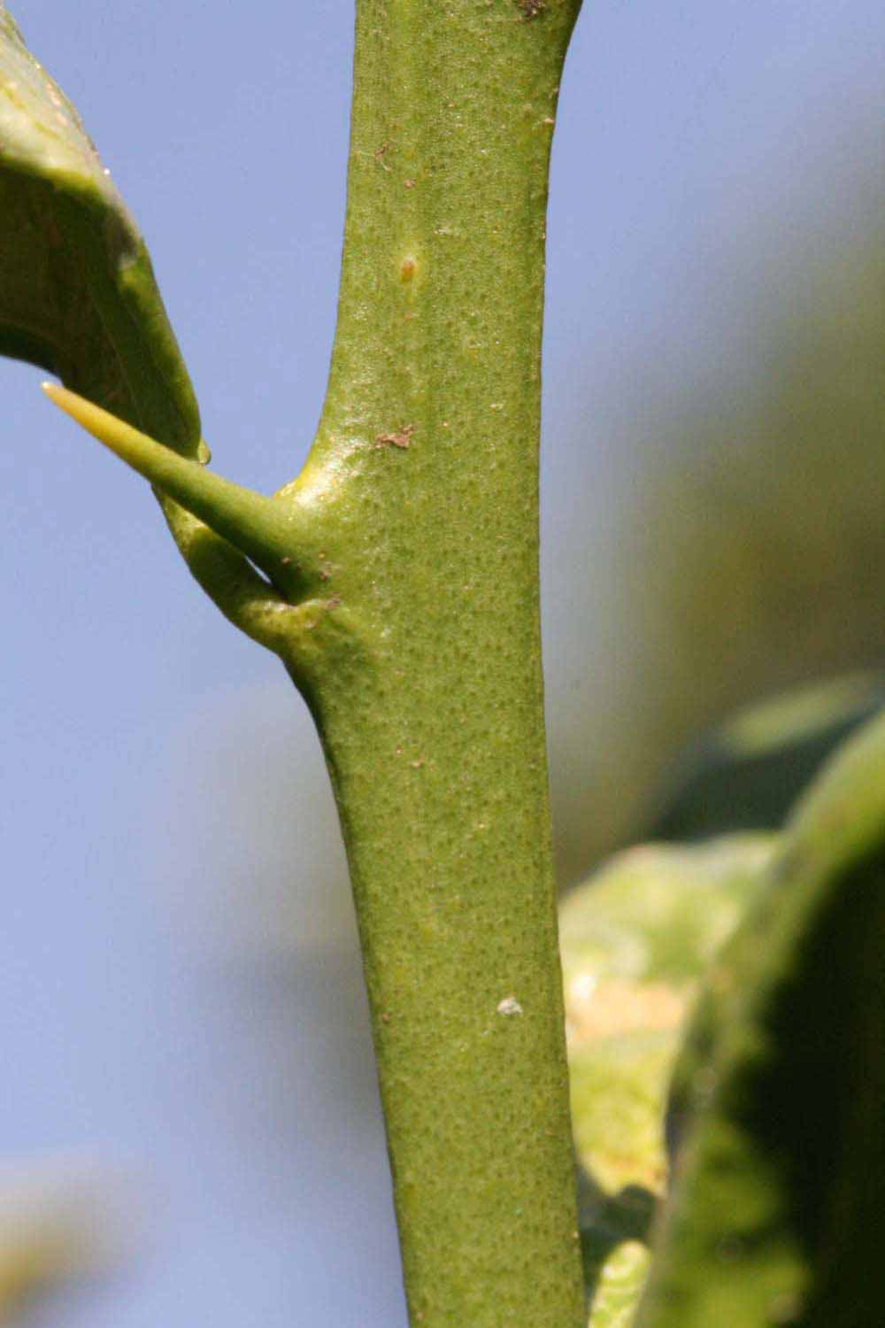 Tree distinctive in appearance, medium-large in size and of spreading but irregular growth habit, with thick, thorny branches; foliage medium-dense. Leaves pale green, medium in size, long-oval, blunt-pointed, and characteristically cupped or rolled, with petioles wing-margined rather than winged as in most limes. Flowers medium-large, pure white, and new shoot growth pure green."