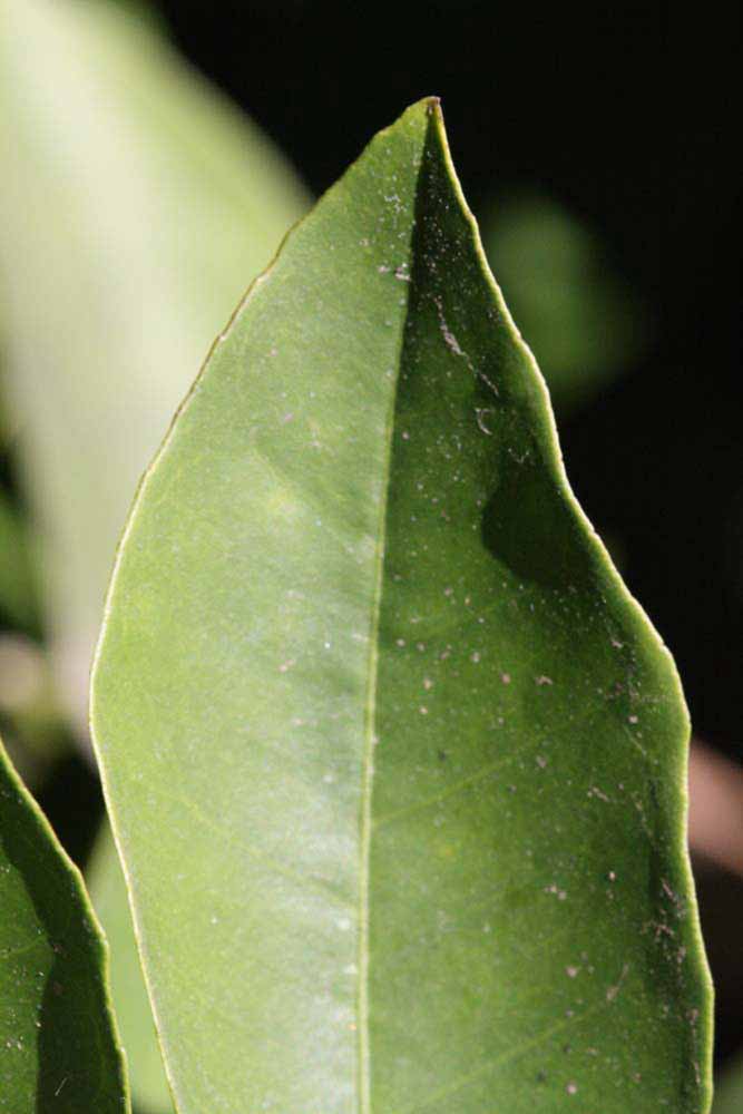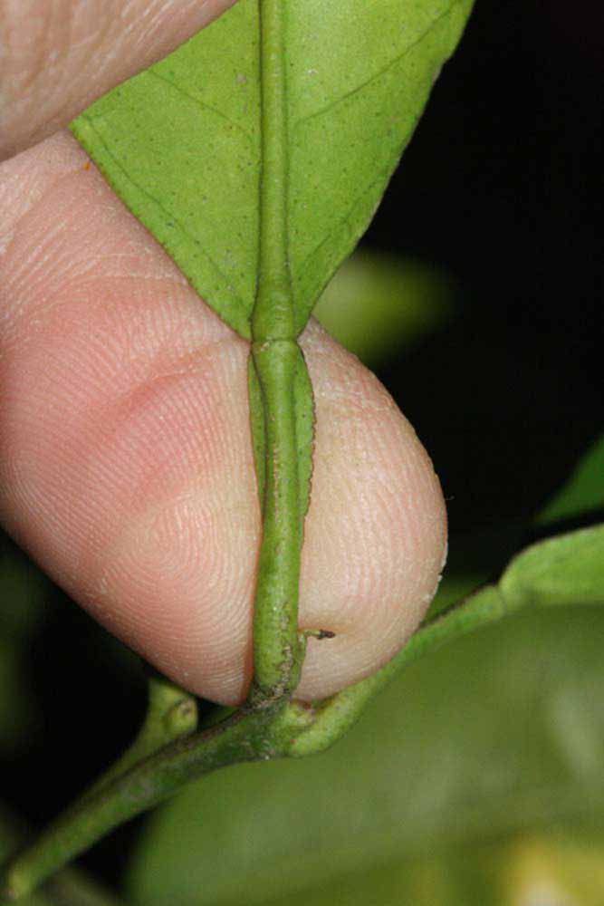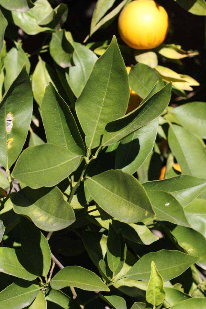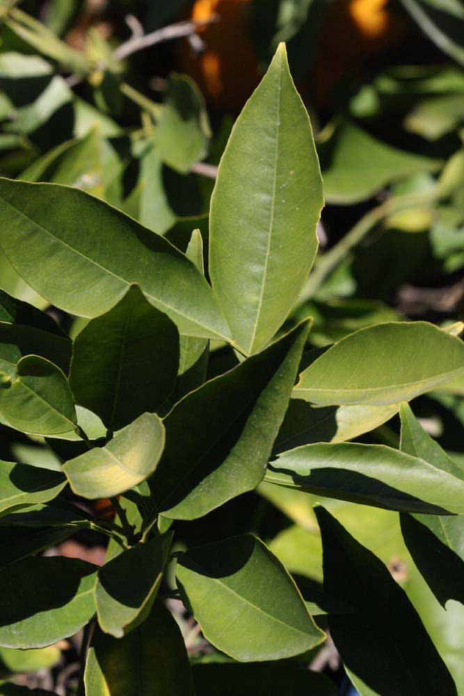 Crown compact or dense, not weeping. First-year twig surface glabrous; second- or third-year twig surface striate; thorns absent or not persistent; prickles absent or not persistent. Petiole glabrous, length medium; wings narrow, adjoining the blade. Leaflets one, margin bluntly toothed, shade leaflet blades flat or weakly conduplicate, sun leaflet blades weakly or strongly conduplicate. Scent of crushed leaflets sweetly orange-like. Fruit as broad as long or longer than broad; rind yellow (7-10), yellow-orange (11), or orange (12); rind texture slightly rough (4-5); firmness leathery; navel absent; flesh orange; taste acidic-sweet.