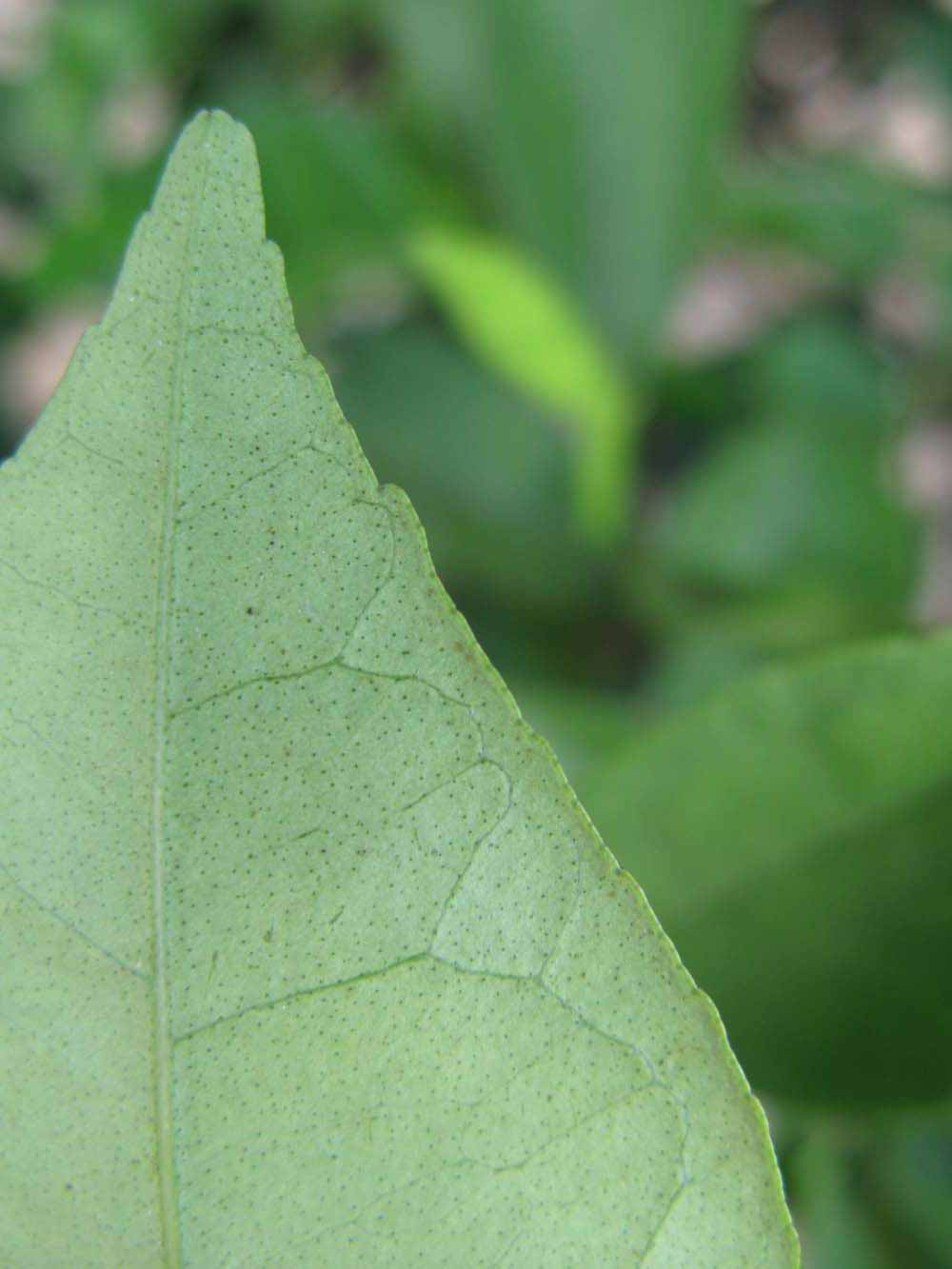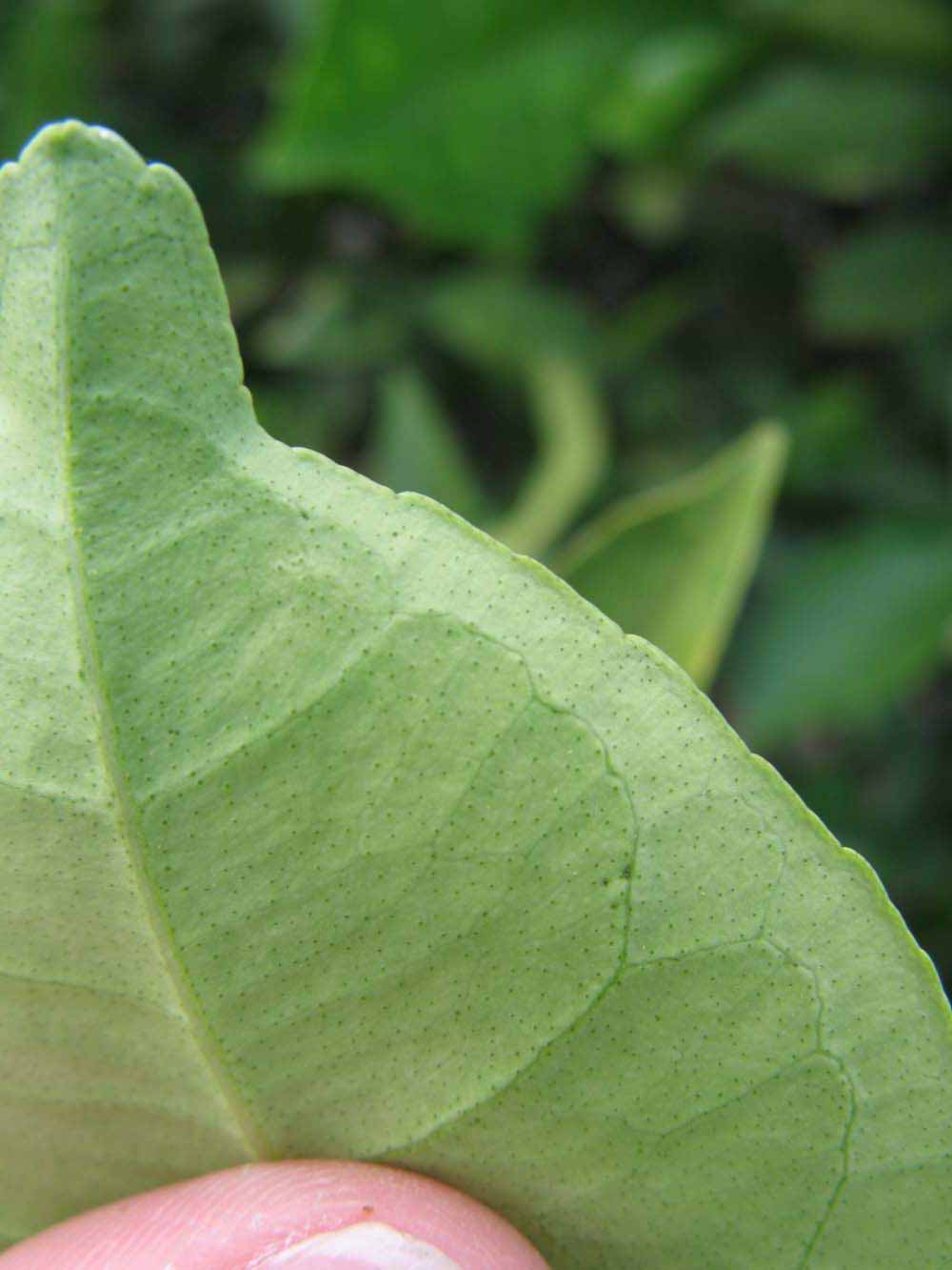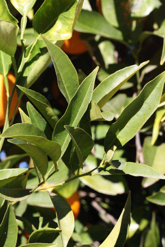 Crown compact or dense; not weeping. First-year twig surface glabrous; second- or third-year twig surface striate; thorns absent or not persistent; prickles absent or not persistent. Petiole glabrous, length short or medium; wings absent, if present, narrow or medium, adjoining the blade. Leaflets one, margin bluntly toothed, shade leaflet blades flat or weakly conduplicate, sun leaflet blades flat, weakly or strongly conduplicate. Scent of crushed leaflets sweetly orange-like. Fruit as broad as long or longer than broad; rind yellow (7-10), yellow-orange (11), orange (12), or red-orange (13); rind texture slightly rough (4-5); firmness leathery; navel absent; flesh orange; taste acidic-sweet.