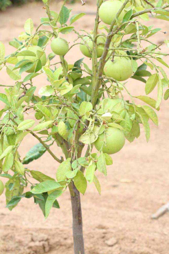 Crown compact or dense, not weeping. First-year twig surface pubescent; second- or third- year twig surface striate; thorns absent or not persistent; prickles absent or not persistent. Petiole pubescent, length medium or long; wings medium or wide, tucking beneath blade. Leaflets one, margin entire or bluntly toothed, shade leaflet blades weakly conduplicate, sun leaflet blades weakly conduplicate. Leaflets not scented when crushed. Fruit broader than long, as broad as long, or longer than broad; rind green-yellow (6), yellow (7-10), or yellow-orange (11); rind texture smooth (1-3) or slightly rough (4-5); firmness leathery; navel absent; flesh red/purplish-tinged; taste acidic-sweet.