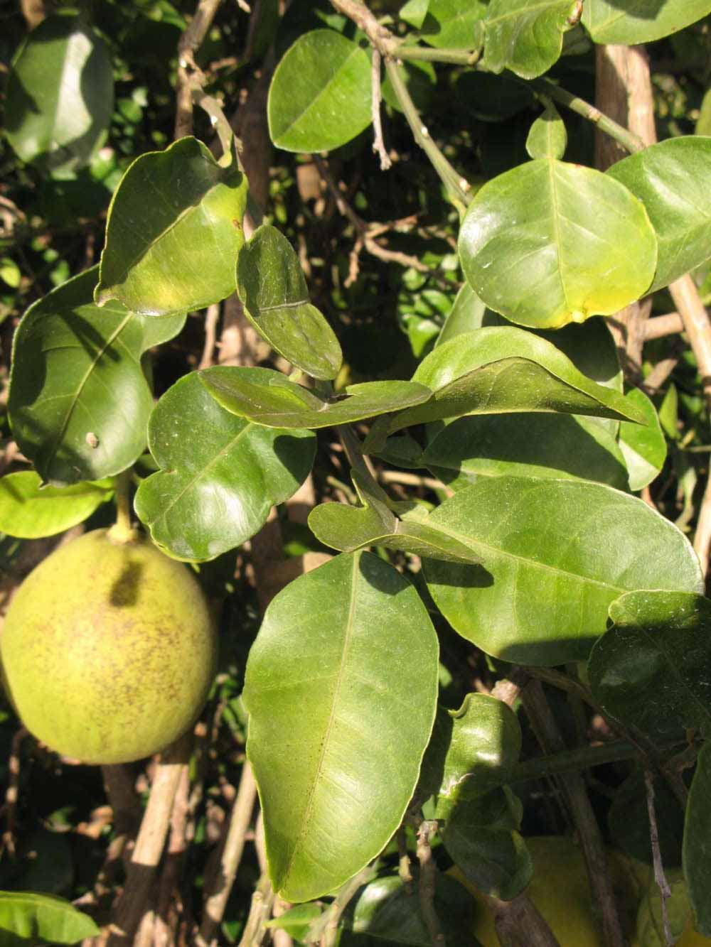 Crown compact or dense, not weeping. First-year twig surface pubescent; second- or third-year twig surface striate; thorns absent or not persistent; prickles absent or not persistent. Petiole pubescent, length medium or long; wings narrow, medium or wide, adjoining the blade or tucking beneath blade. Leaflets one, margin entire, shade leaflet blades flat, sun leaflet blades flat or weakly conduplicate. Leaflets not scented when crushed. Fruit as broad as long or longer than broad; rind green-yellow (6), yellow (7-10), or yellow-orange (11); rind texture slightly rough (4-5); firmness leathery; navel absent; flesh red/purplish-tinged; taste grapefruit-like.