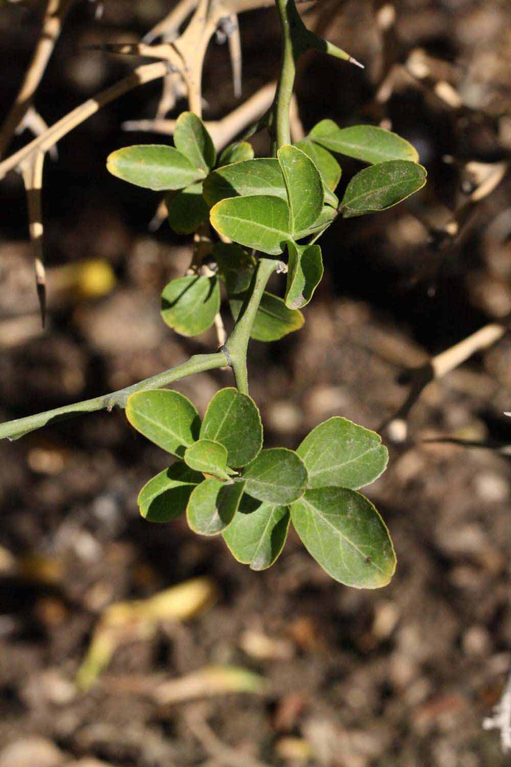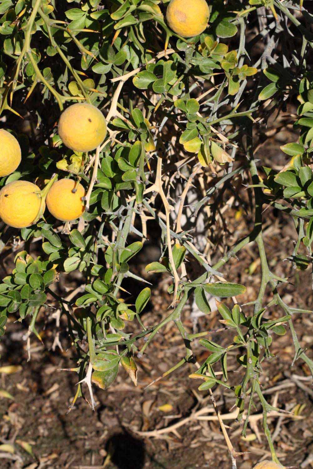 Crown compact or dense, not weeping. First-year twig surface glabrous; second- or third-year twig surface striate; thorns straight; prickles absent or not persistent. Petiole glabrous, length very long; wings medium, adjoining blade. Leaflets three, margin bluntly toothed, rachis wings absent, shade leaflet blades weakly conduplicate, sun leaflet blades weakly or strongly conduplicate. Leaflets not scented when crushed. Fruit as broad as long or longer than broad; rind yellow (7-10), yellow-orange (11), or orange (12); rind texture slightly rough (4-5) or medium rough (6-7); firmness leathery; navel absent; flesh orange or green/greenish; taste sour.
