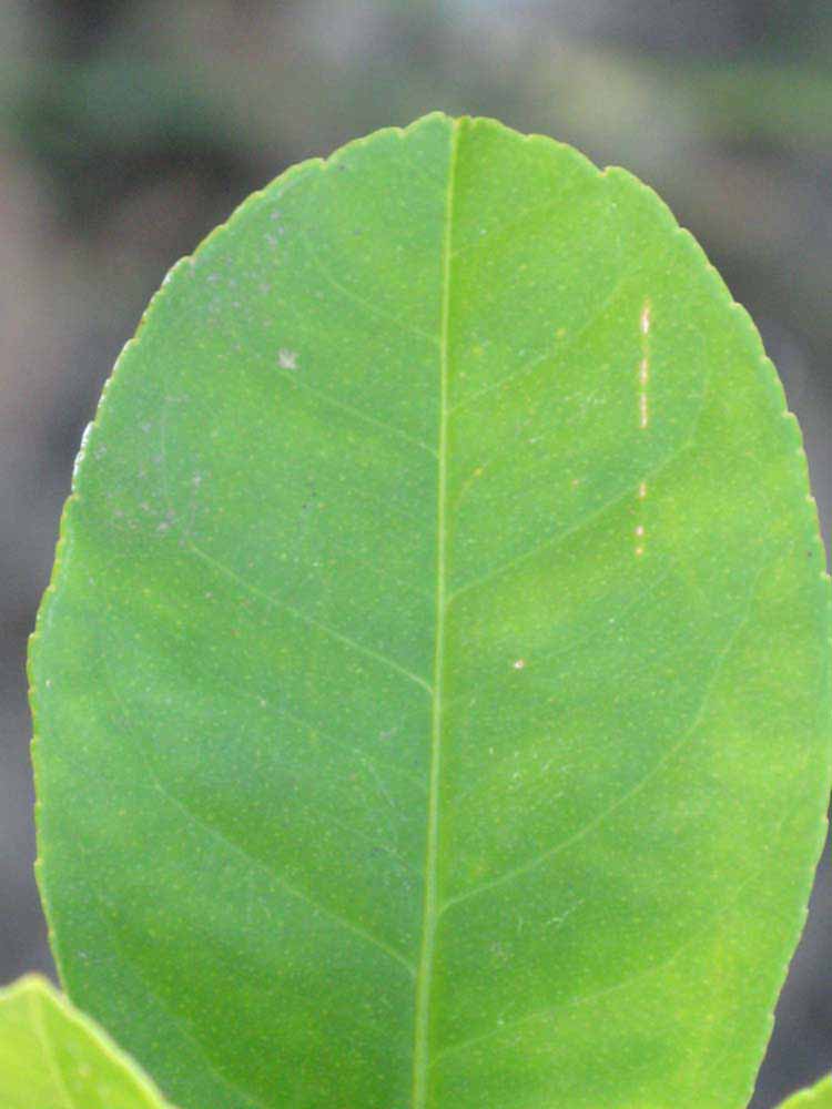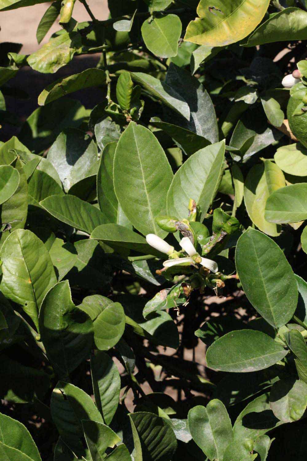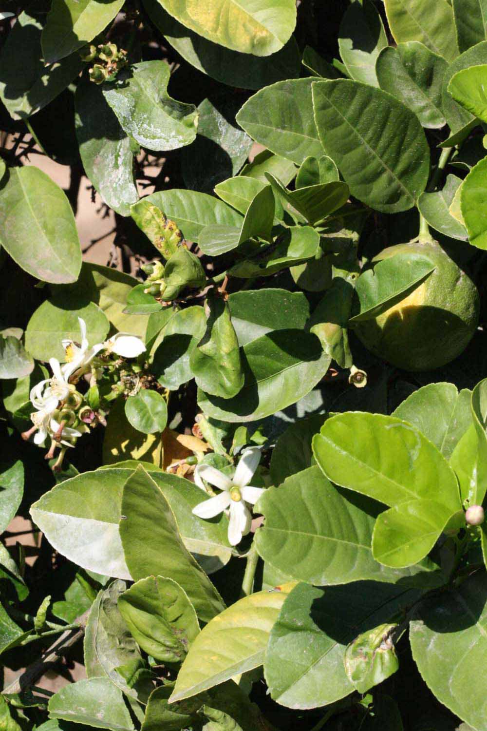 Tree small, round-topped, and productive; branches medium-thick and theory; leaves large elliptical to oblong and citron-like. Flowers and new growth purple-tinged. Everflowering. Tree sensitive to cold."