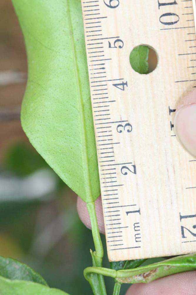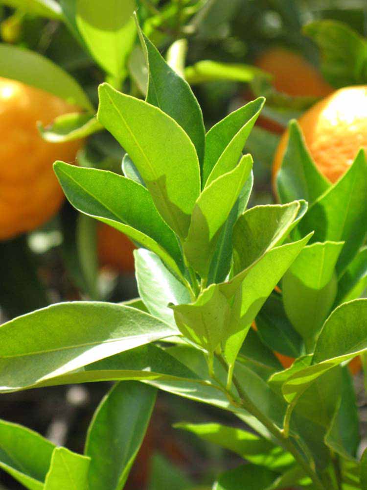Crown compact or dense, not weeping. First-year twig surface glabrous; second- or third-year twig surface striate; thorns absent or not persistent; prickles absent or not persistent. Petiole glabrous, length medium; wings narrow, adjoining the blade. Leaflets one, margin entire (by misinterpretation), crenate/crenulate or bluntly toothed, shade leaflet blades flat or weakly conduplicate, sun leaflet blades weakly conduplicate. Scent of crushed leaflets mandarin-like. Fruit broader than long; rind yellow-orange (11), orange (12), or red-orange (13); rind texture slightly rough (4-5) or medium rough (6-7); firmness leathery; navel absent; flesh orange; taste acidic-sweet.