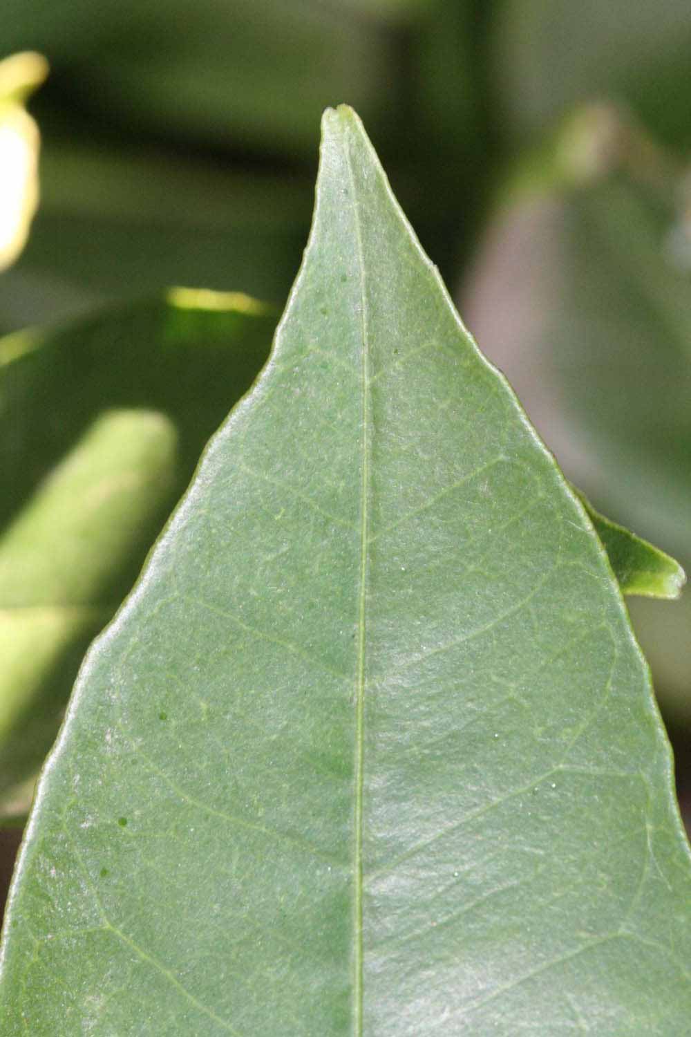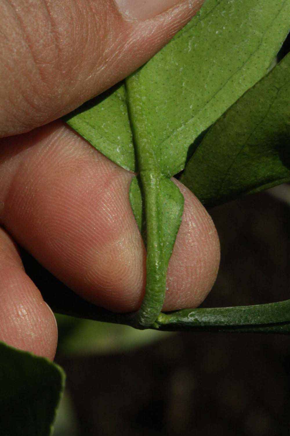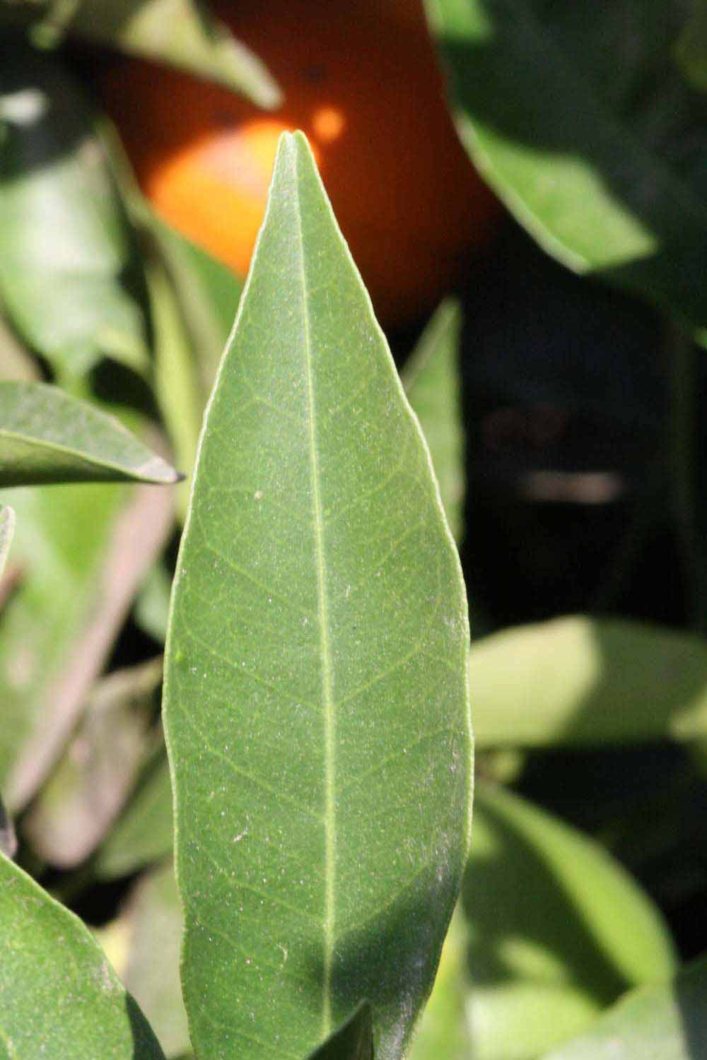 Crown compact or dense, not weeping. First-year twig surface glabrous; second- or third-year twig surface striate; thorns absent or not persistent; prickles absent or not persistent. Petiole glabrous, length short or medium; wings narrow or medium, adjoining the blade. Leaflets one, margin entire or bluntly toothed, shade leaflet blades weakly conduplicate, sun leaflet blades weakly or strongly conduplicate. Scent of crushed leaflets sweetly orange-like. Fruit as broad as long or longer than broad; rind yellow (7-10), yellow-orange (11), orange (12), or red-orange (13); rind texture slightly rough (4-5); firmness leathery; navel present; flesh orange; taste acidic-sweet.
