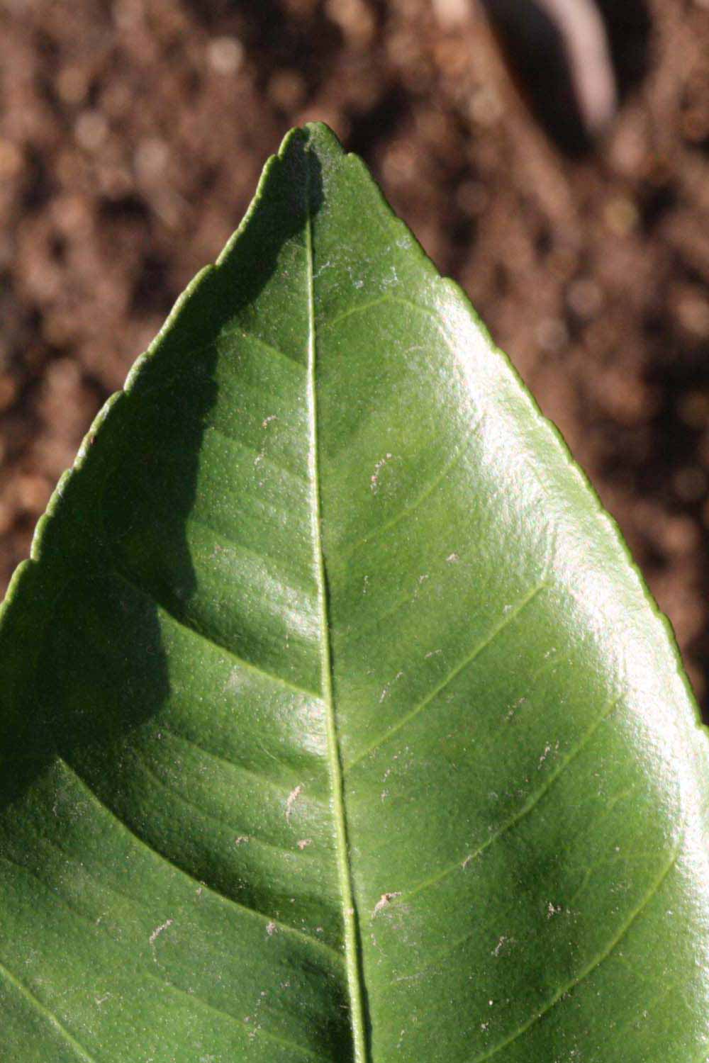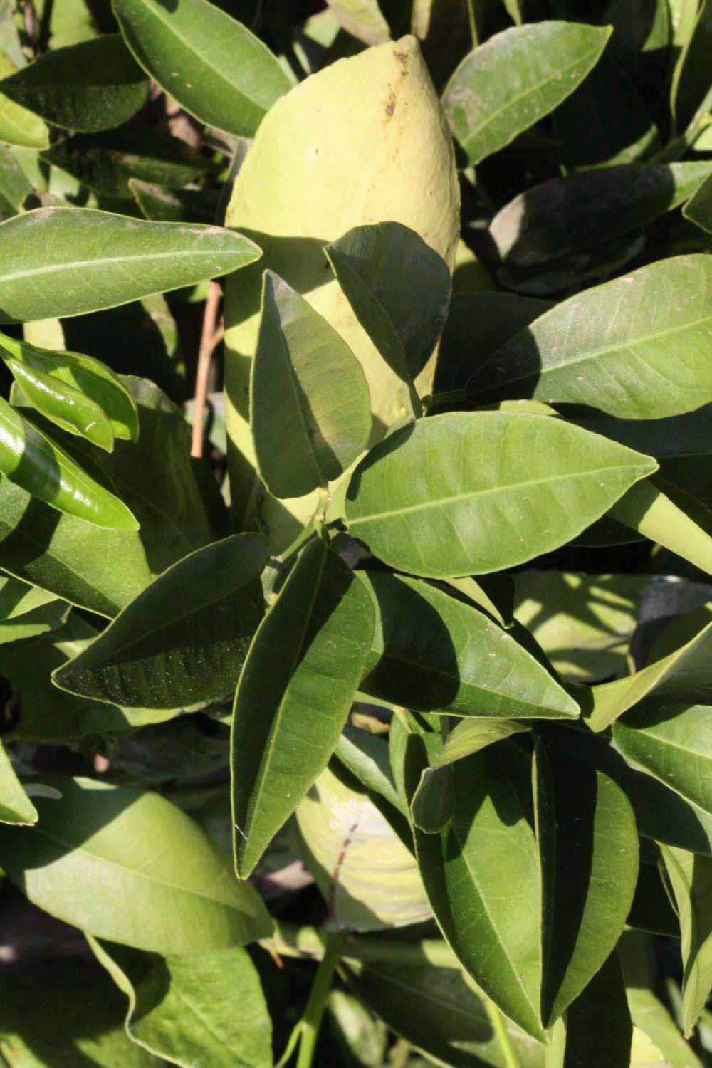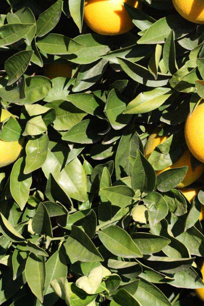 Crown compact or dense, not weeping. First-year twig surface glabrous; second- or third-year twig surface striate; thorns absent or not persistent; prickles absent or not persistent. Petiole glabrous, length short or medium; wings narrow or medium, adjoining the blade. Leaflets one, margin entire or bluntly toothed, shade leaflet blades weakly conduplicate, sun leaflet blades weakly or strongly conduplicate. Scent of crushed leaflets sweetly orange-like. Fruit as broad as long or longer than broad; rind yellow (7-10), yellow-orange (11), orange (12), or red-orange (13); rind texture slightly rough (4-5); firmness leathery; navel present; flesh orange; taste acidic-sweet.