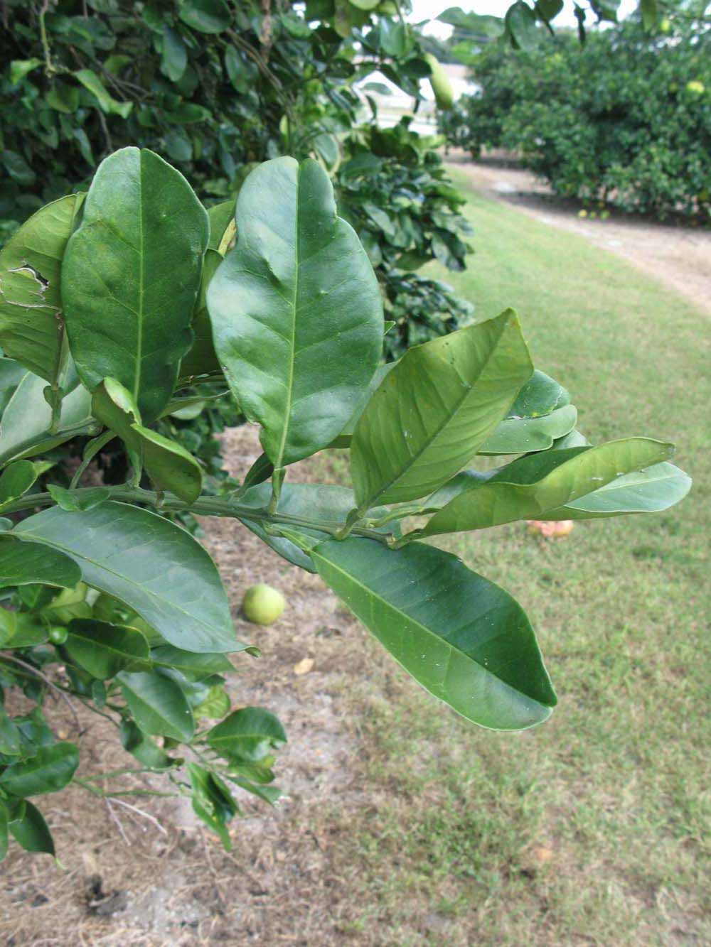 Crown compact or dense, not weeping. First-year twig surface pubescent; second- or third-year twig surface striate; thorns absent or not persistent; prickles absent or not persistent. Petiole pubescent, length medium, wings narrow or medium, adjoining the blade. Leaflets one, margin entire, shade leaflet blades weakly conduplicate, sun leaflet blades weakly conduplicate. Leaflets not scented when crushed. Fruit broader than long; rind green-yellow (6), yellow (7-10), or yellow-orange (11); rind texture smooth (1-3); firmness leathery; navel absent; flesh red/purplish-tinged; taste grapefruit-like.