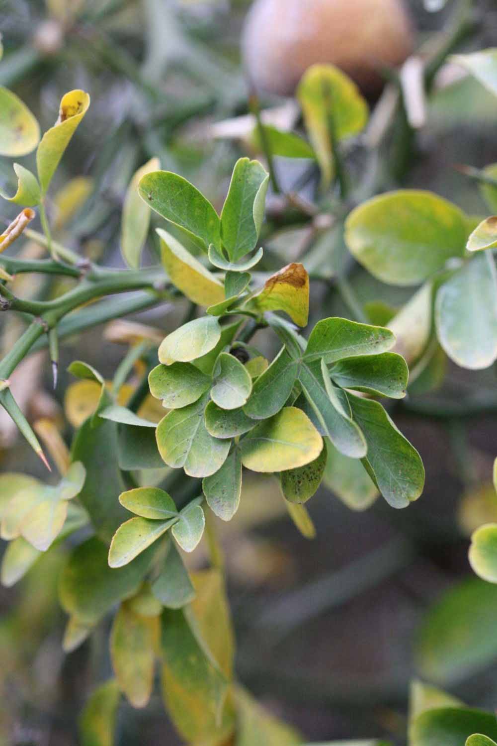 Crown compact or dense, not weeping. First-year twig surface glabrous; second- or third-year twig surface striate; thorns absent or not persistent; prickles absent or not persistent. Petiole glabrous, length very long; wings medium, adjoining the blade. Leaflets three, margin bluntly toothed, rachis wings absent, shade leaflet blades weakly conduplicate, sun leaflet blades weakly or strongly conduplicate. Leaflets not scented when crushed. Fruit as broad as long or longer than broad; rind yellow (7-10), yellow-orange (11), or orange (12); rind texture medium rough (6-7); firmness leathery; navel absent; flesh orange or green/greenish; taste sour.
