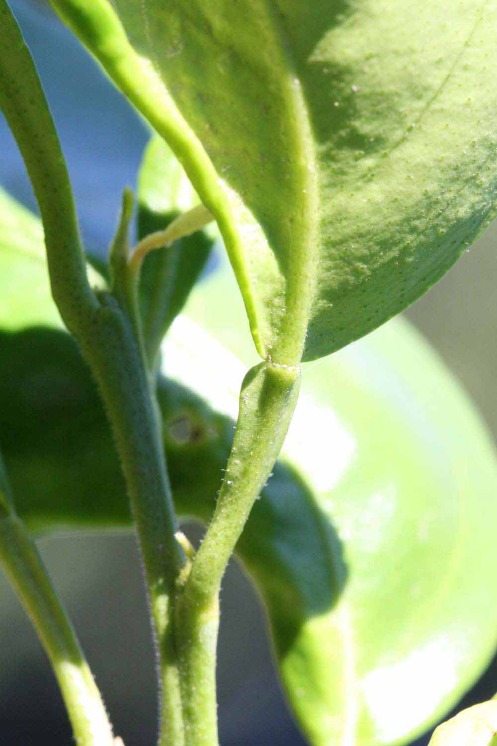 Crown compact or dense, not weeping. First-year twig surface pubescent; second- or third-year twig surface striate; thorns straight, prickles absent or not persistent. Petiole pubescent, length short or medium; wings narrow, medium or wide, adjoining the blade. Leaflets one, margin bluntly toothed, shade leaflet blades flat or weakly conduplicate, sun leaflet blades weakly conduplicate. Scent of crushed leaflets sweetly orange-like. Fruit broader than long, as broad as long, or longer than broad; rind green-yellow (6), yellow (7-10), yellow-orange (11), or orange (12); rind texture smooth (1-3) or slightly rough (4-5); firmness leathery; navel absent; flesh red/purplish-tinged; taste grapefruit-like.