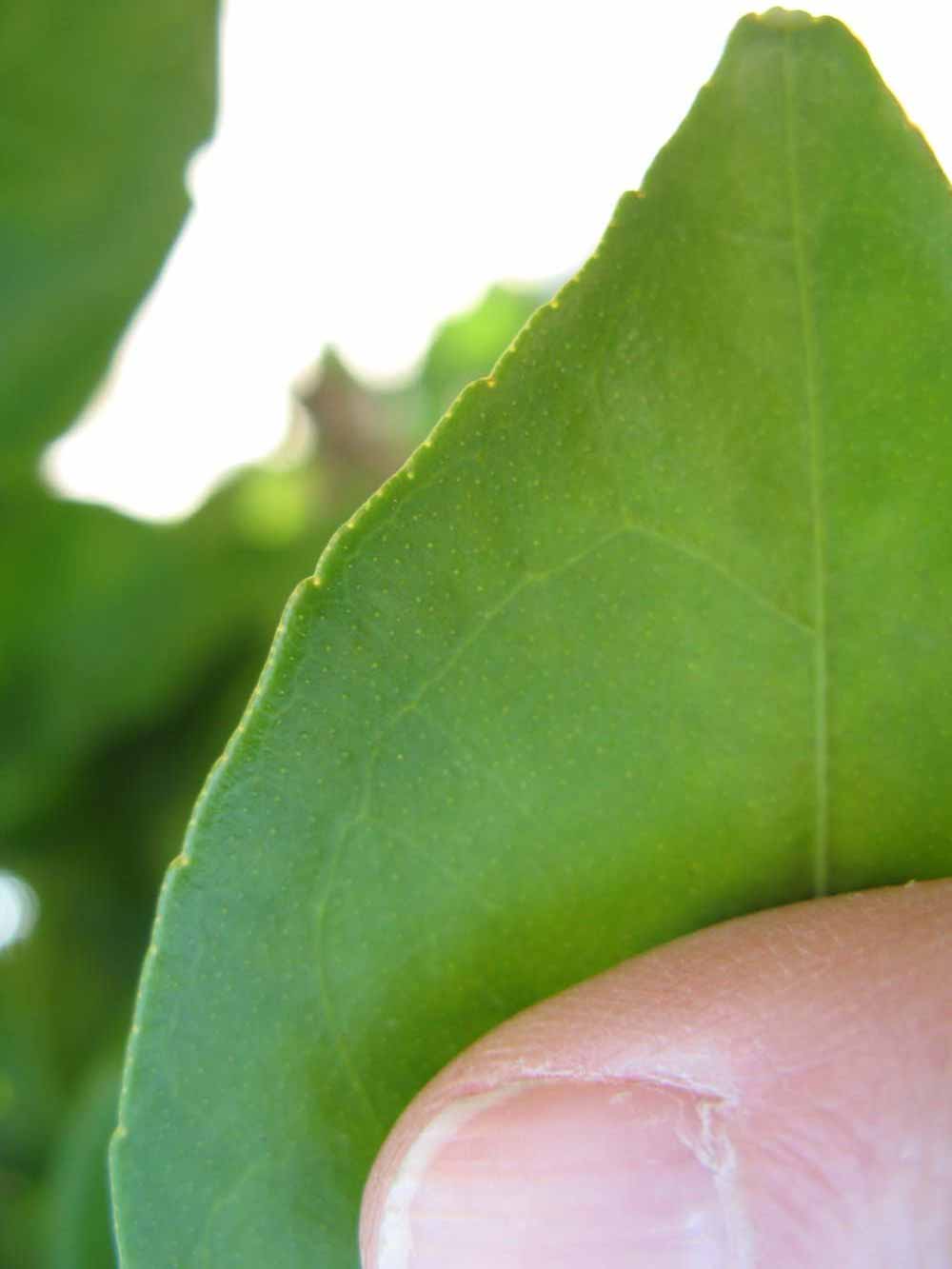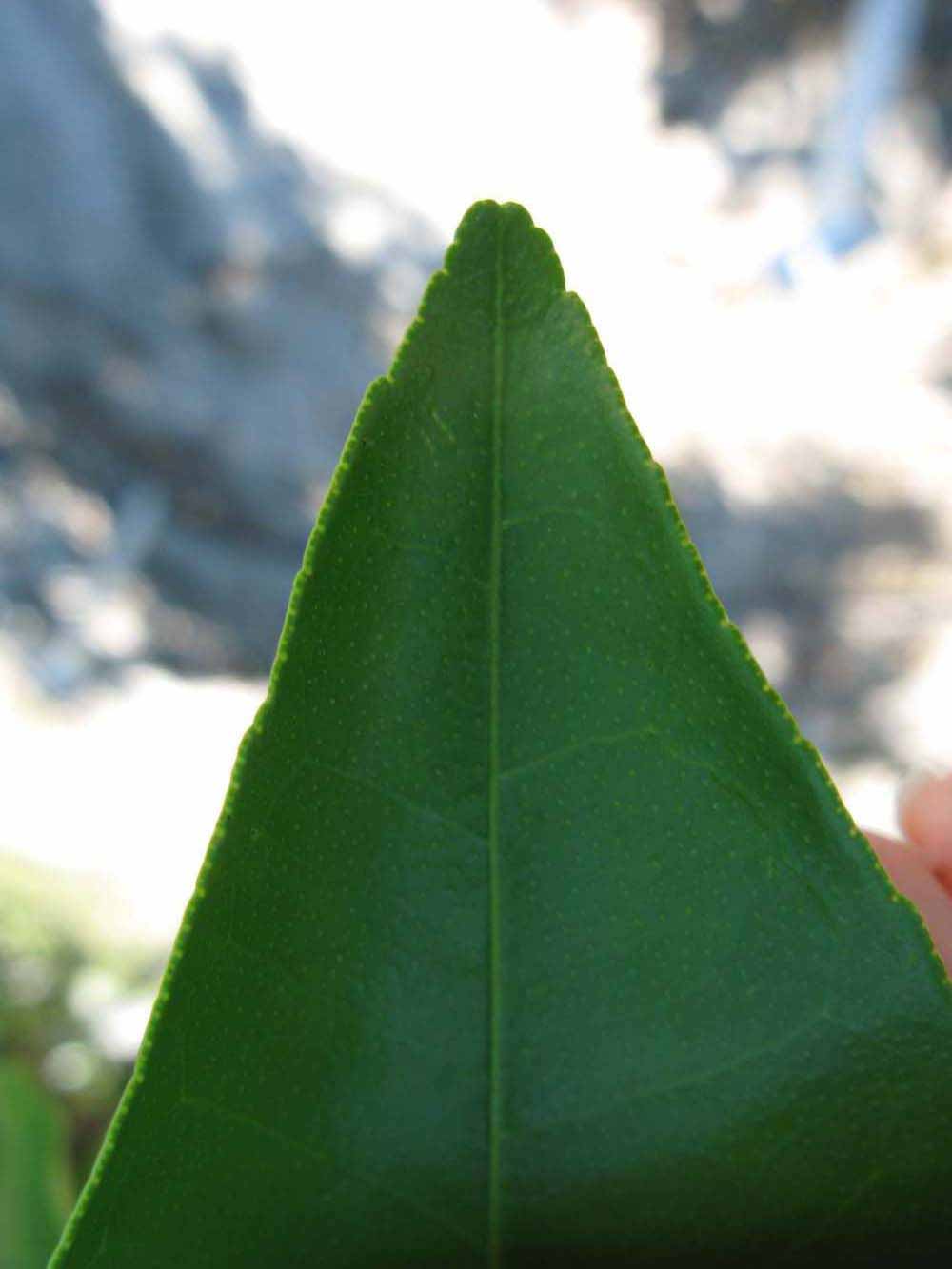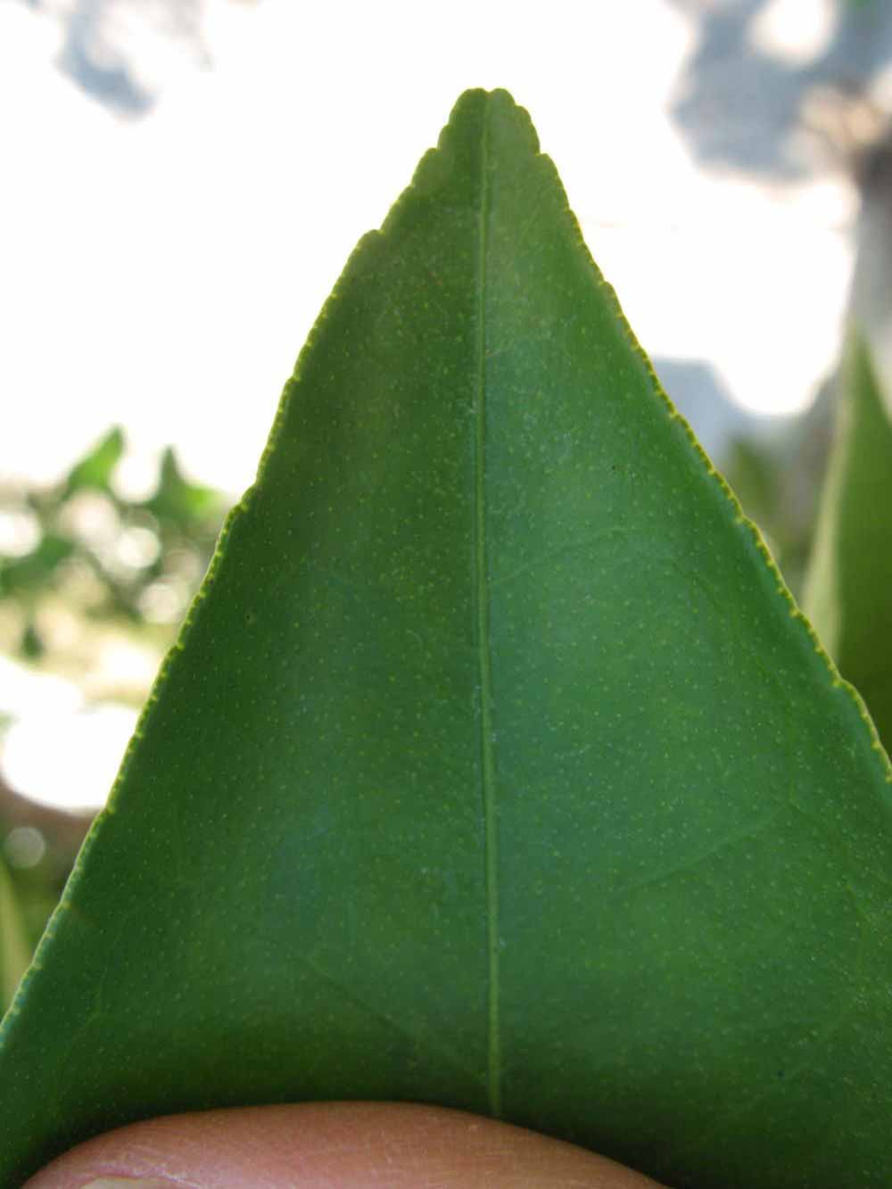 Crown compact or dense, not weeping. First-year twig surface glabrous; second- or third-year twig surface striate; thorns absent or not persistent; prickles absent or not persistent. Petiole glabrous, length short or medium; wings narrow or medium, adjoining the blade. Leaflets one, margin bluntly toothed, shade leaflet blades flat or weakly conduplicate, sun leaflet blades weakly or strongly conduplicate. Scent of crushed leaflets sweetly orange-like. Fruit as broad as long or longer than broad; rind yellow (7-10), yellow-orange (11), or orange (12); rind texture slightly rough (4-5); firmness leathery; navel absent; flesh orange; taste acidic-sweet.