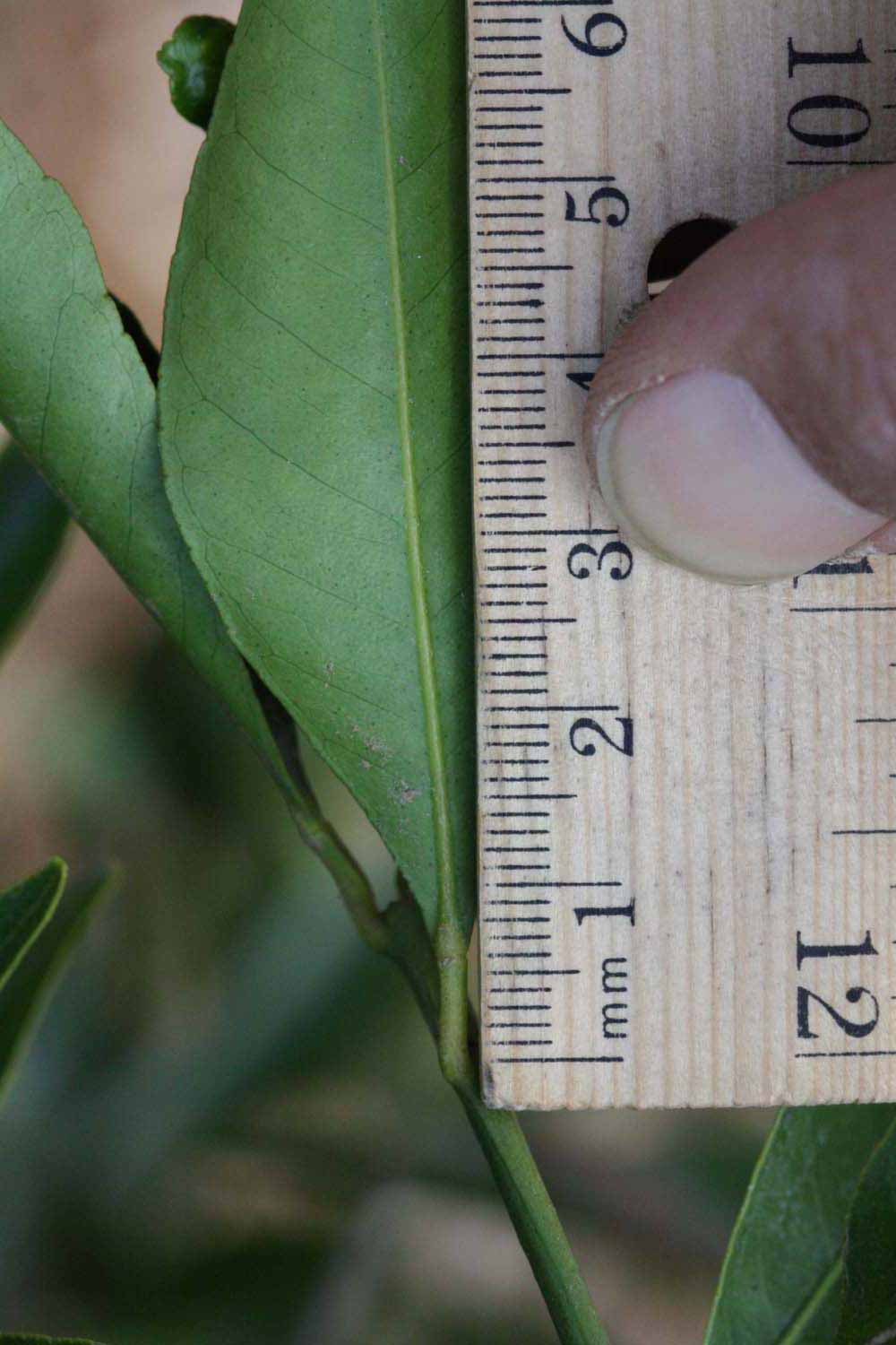 Crown compact or dense, not weeping. First-year twig surface glabrous; second- or third-year twig surface striate; thorns absent or not persistent; prickles absent or not persistent. Petiole glabrous, length short; wings absent, if present, narrow, adjoining the blade. Leaflets one, margin entire or bluntly toothed, shade leaflet blades flat or weakly conduplicate, sun leaflet blades weakly or strongly conduplicate. Scent of crushed leaflets mandarin-like. Fruit broader than long; rind yellow (7-10), yellow-orange (11), orange (12), or red-orange (13); rind texture slightly rough (4-5); firmness leathery; navel absent; flesh orange; taste acidic-sweet.