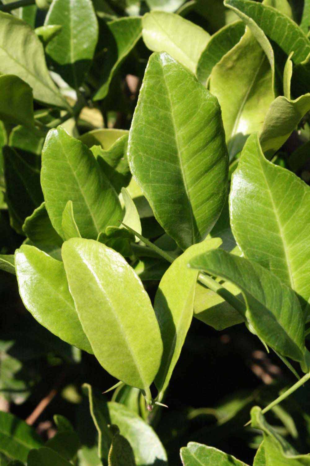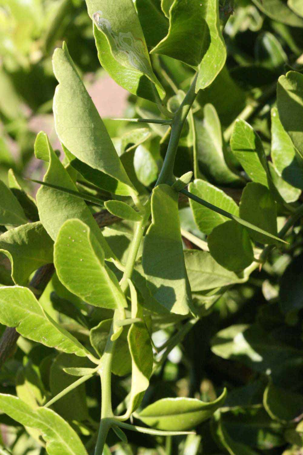 Crown compact or dense, not weeping. First-year twig surface pubescent; second- or third-year twig surface mottled; thorns straight; prickles absent or not persistent. Petiole glabrous, length short; wings absent. Leaflets one, margin bluntly toothed or crenate/crenulate, shade leaflet blades weakly conduplicate, sun leaflet blades weakly conduplicate. Scent of crushed leaflets sweetly orange-like. Fruit broader than long, as broad as long, or longer than broad; rind black, medium green (4), light green with some break to yellow (5), or green-yellow (6); rind texture smooth (1-3); firmness membranous; navel absent.