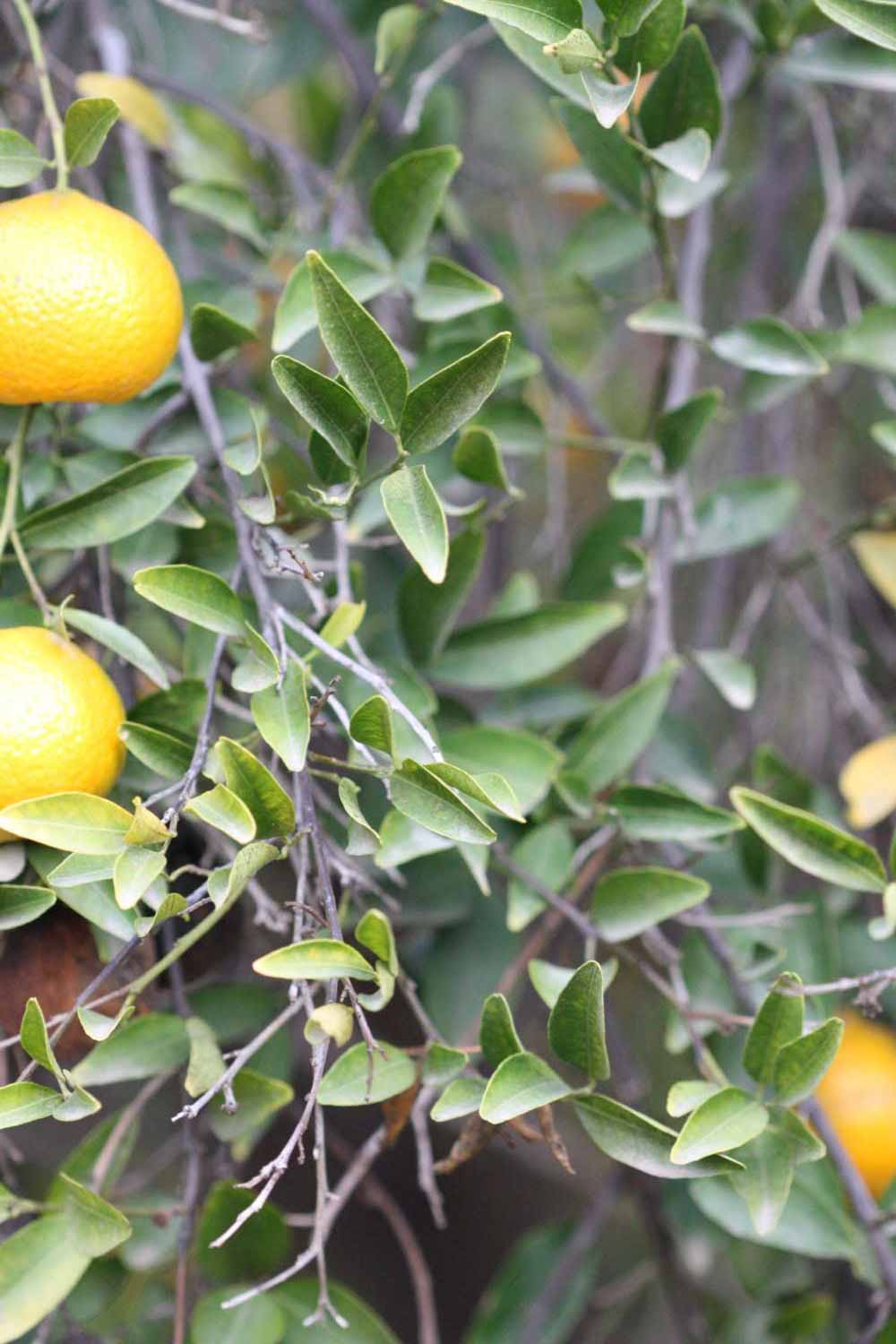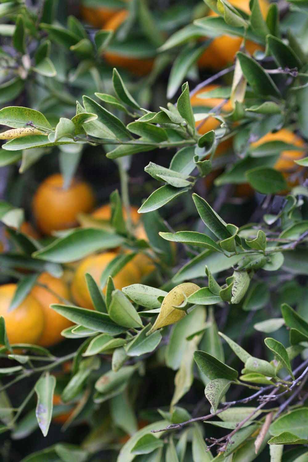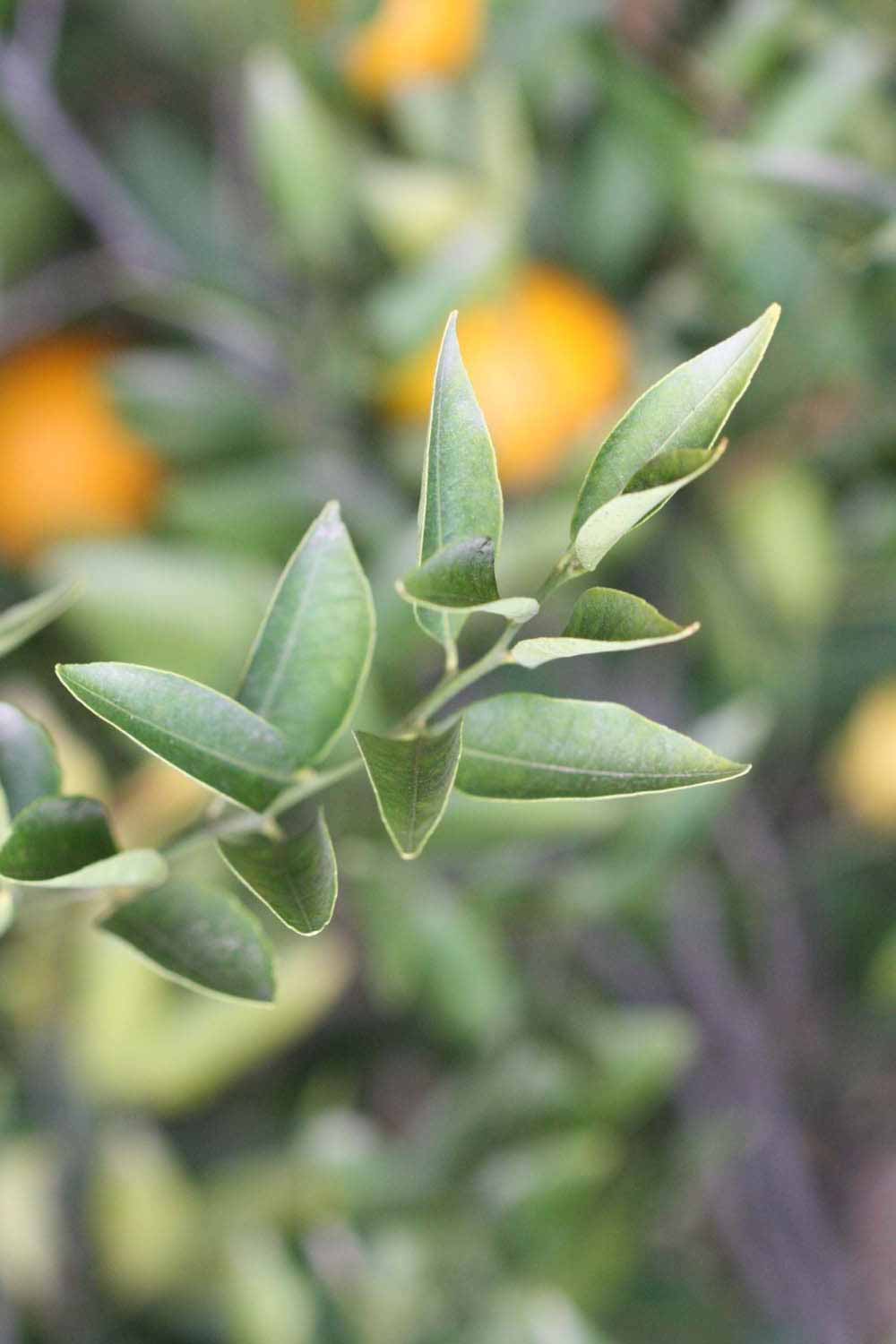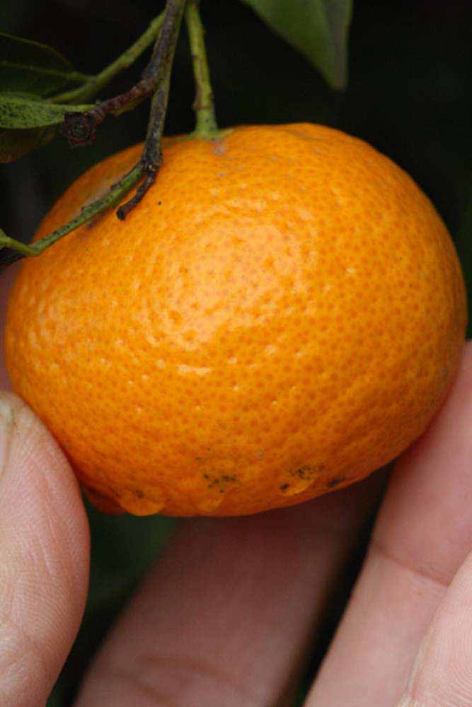 Crown compact or dense, not weeping. First-year twig surface glabrous; second- or third-year twig surface striate; thorns absent or not persistent; prickles absent or not persistent. Petiole glabrous, length short; wings absent. Leaflets one, margin entire or bluntly toothed, shade leaflet blades flat or weakly conduplicate, sun leaflet blades weakly or strongly conduplicate. Scent of crushed leaflets mandarin-like. Fruit broader than long; rind yellow (7-10), yellow-orange (11), orange (12), or red-orange (13); rind texture slightly rough (4-5); firmness leathery; navel absent; flesh orange; taste acidic-sweet.