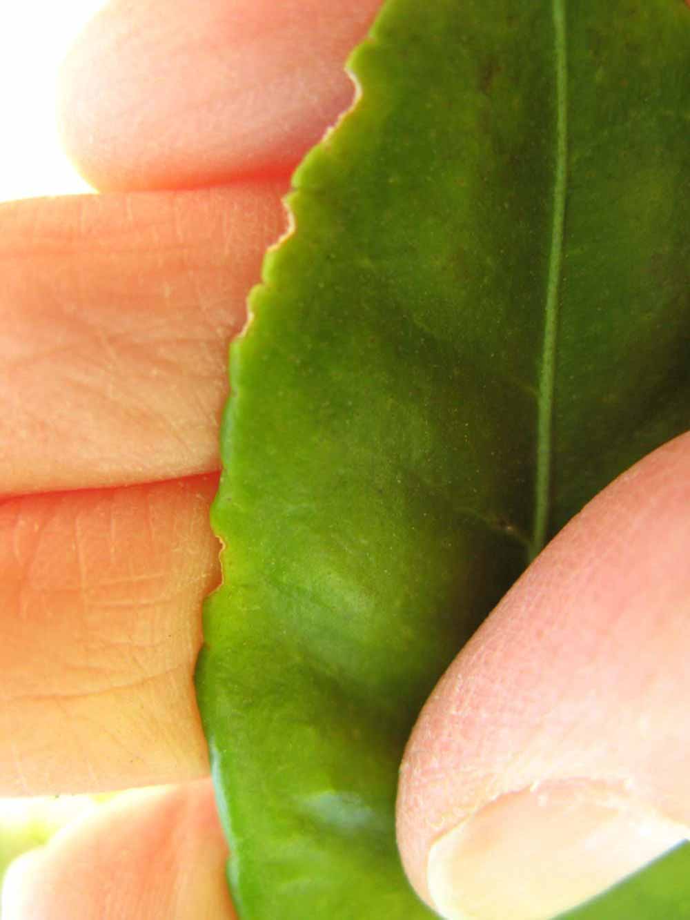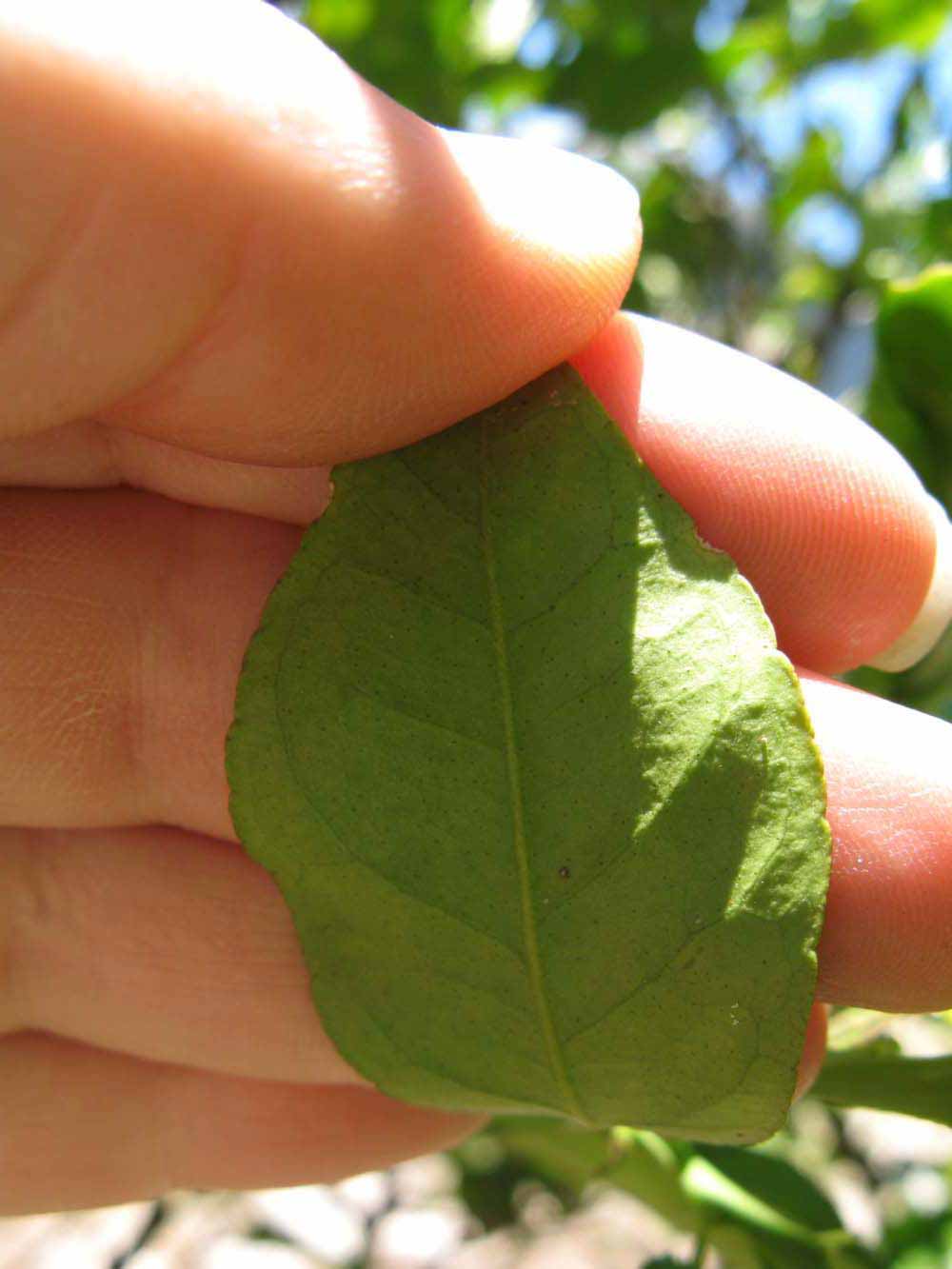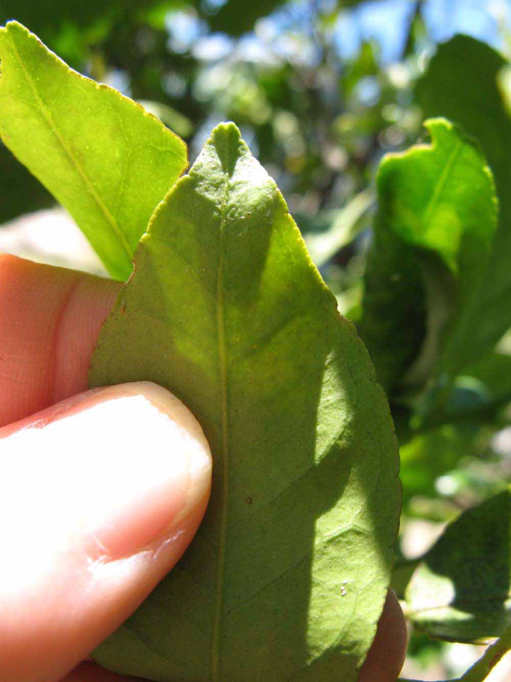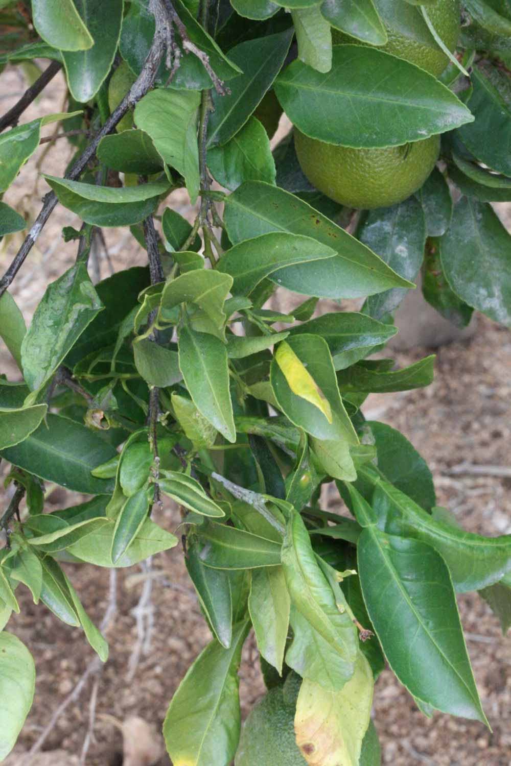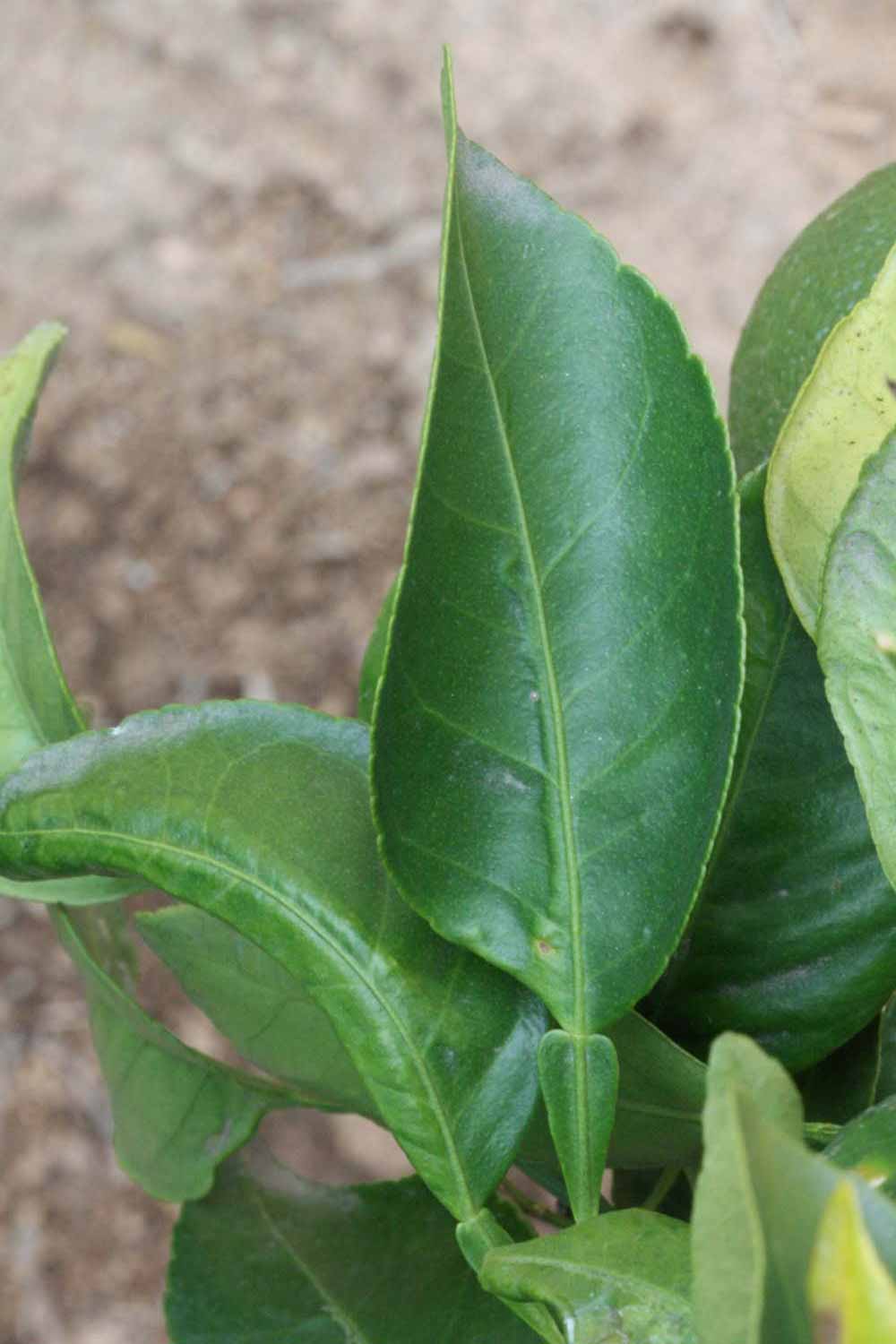 Crown compact or dense, not weeping. First-year twig surface glabrous; second- or third-year twig surface striate; thorns absent or not persistent; prickles absent or not persistent. Petiole glabrous, length medium; wings medium, adjoining the blade. Leaflets one, margin crenate/crenulate or bluntly toothed, shade leaflet blades flat or weakly conduplicate, sun leaflet blades flat or weakly conduplicate. Scent of crushed leaflets mandarin-like. Fruit as broad as long or longer than broad; rind yellow (7-10), yellow-orange (11), or orange (12); rind texture slightly rough (4-5); firmness leathery; navel absent; flesh orange; taste acidic-sweet.
