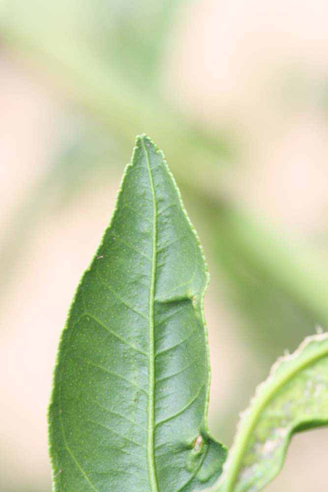 Crown compact or dense, not weeping. First-year twig surface glabrous; second- or third-year twig surface striate; thorns absent or not persistent; prickles absent or not persistent. Petiole glabrous, length short; wings narrow, adjoining the blade. Leaflets one, margin bluntly toothed, shade leaflet blades weakly conduplicate, sun leaflet blades weakly or strongly conduplicate. Scent of crushed leaflets mandarin-like. Fruit broader than long; rind yellow (7-10), yellow-orange (11), orange (12), or red-orange (13); rind texture slightly rough (4-5) or medium rough (6-7); firmness leathery; navel absent; flesh orange; taste acidic-sweet.