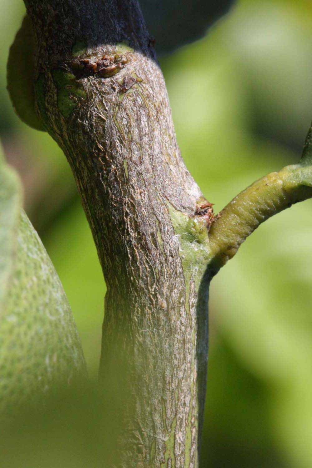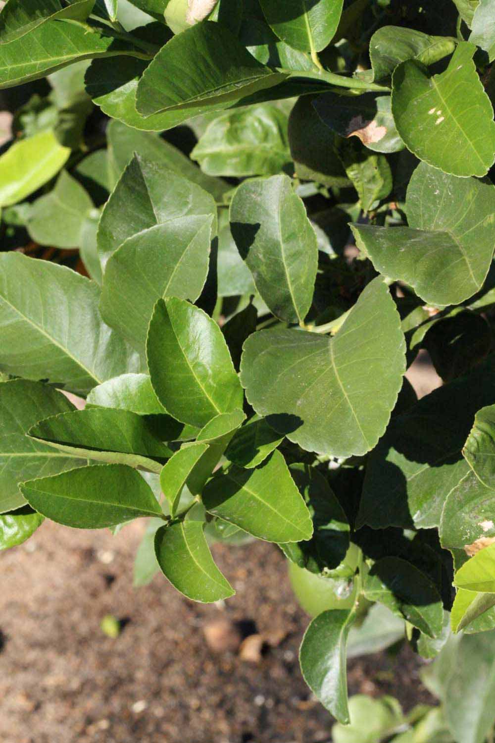 Crown compact or dense, not weeping. First-year twig surface glabrous; second- or third-year twig surface striate; thorns absent or not persistent; prickles absent or not persistent. Petiole glabrous, length short; wings absent. Leaflets one, margin bluntly toothed or serrate/serrulate, shade leaves weakly conduplicate, sun leaflet blades weakly conduplicate. Scent of crushed leaflets freshly lemon-like. Fruit as broad as long or longer than broad; rind green-yellow (6), yellow (7-10), yellow-orange (11), or orange (12); rind texture slightly rough (4-5); firmness leathery; navel absent; flesh yellow; taste sour.
