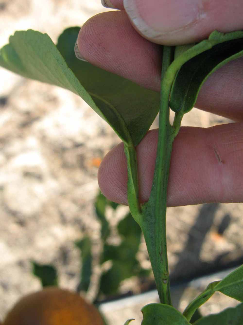 Crown compact or dense, not weeping. First-year twig surface glabrous, second- or third-year twig surface striate; thorns absent or not persistent; prickles absent or not persistent. Petiole glabrous, length short; wings absent, if present, narrow, adjoining the blade. Leaflets one, margin bluntly toothed, shade leaflet blades weakly conduplicate, sun leaflet blades weakly or strongly conduplicate. Scent of crushed leaflets mandarin-like. Fruit as broad as long or longer than broad; rind yellow (7-10), yellow-orange (11), orange (12), or red-orange (13); rind texture slightly rough (4-5); firmness leathery; navel absent; flesh orange; taste acidic-sweet.