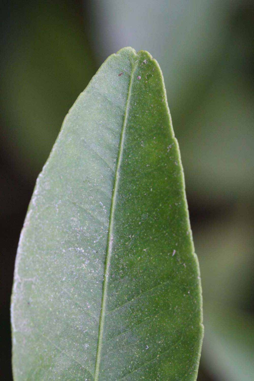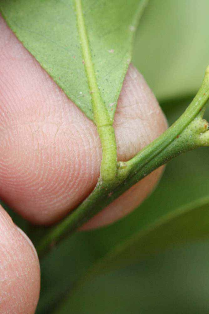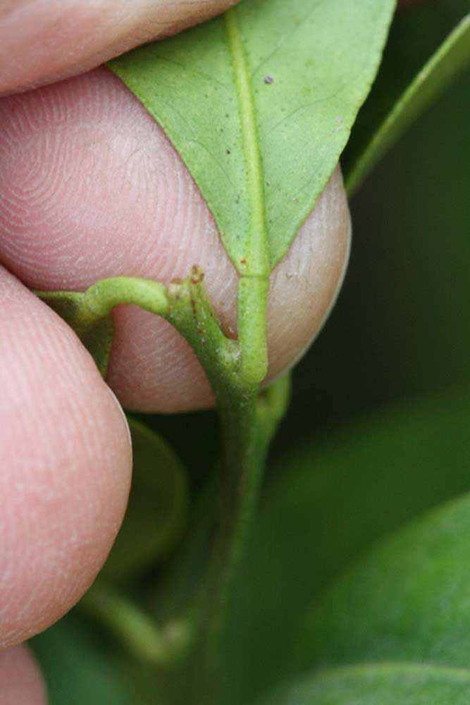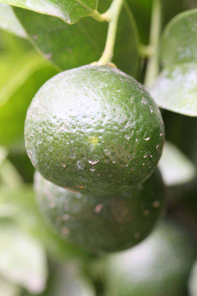 Crown compact or dense, not weeping. First-year twig surface glabrous; second- or third-year twig surface striate; thorns absent or not persistent; prickles absent or not persistent. Petiole glabrous, length short; wings absent, if present, narrow, adjoining the blade. Leaflets one, margin entire (by misinterpretation), crenate/crenulate or bluntly toothed, shade leaflet blades weakly conduplicate, sun leaflet blades weakly or strongly conduplicate. Scent of crushed leaflets mandarin-like. Fruit broader than long; rind yellow (7-10), yellow-orange (11), or orange (12); rind texture slightly rough (4-5) or medium rough (6-7); firmness leathery; navel absent; flesh orange; taste sour.