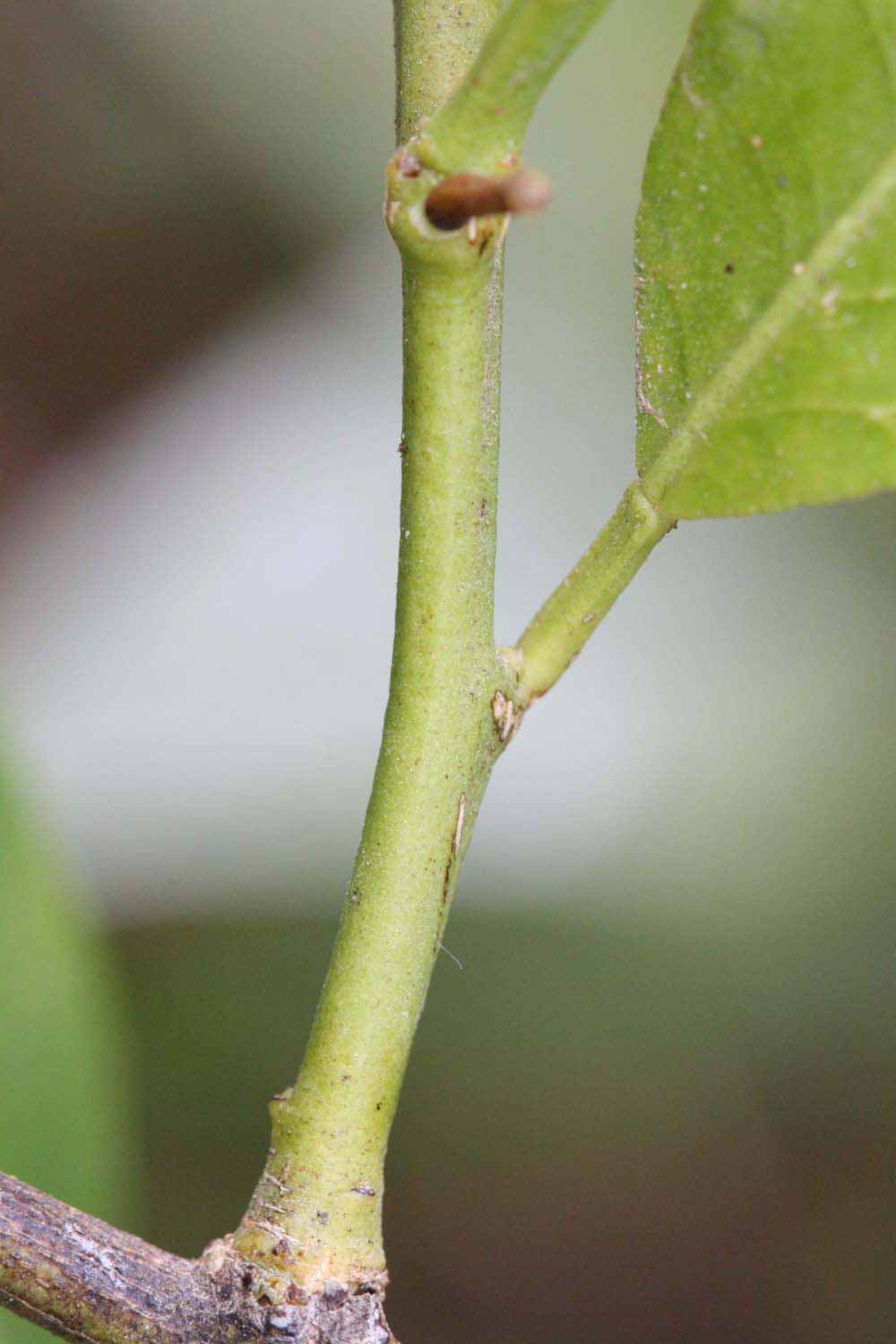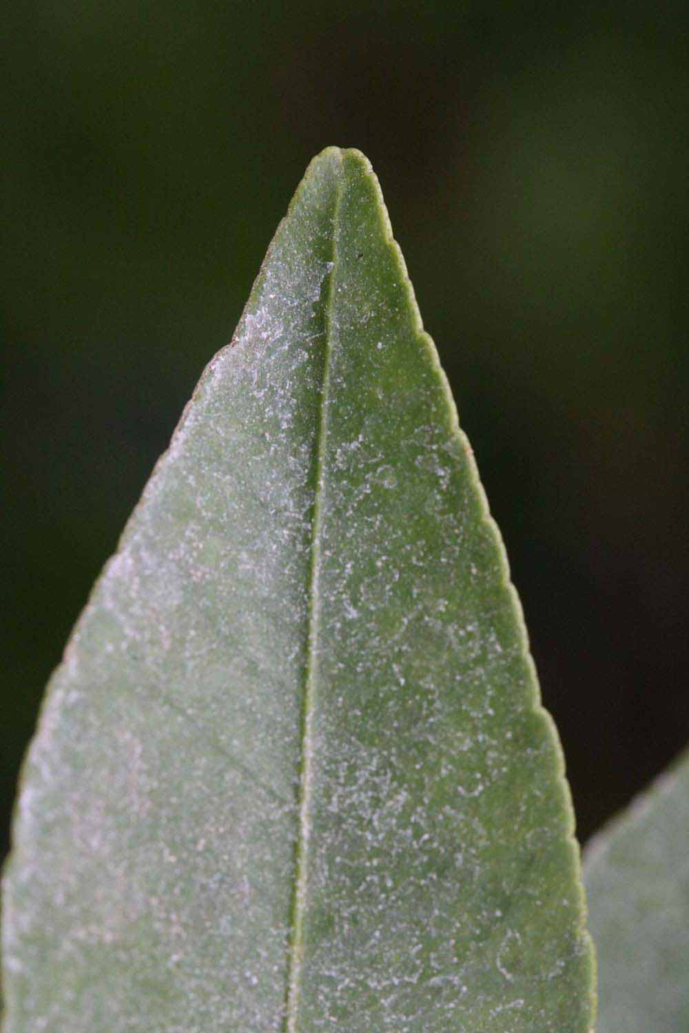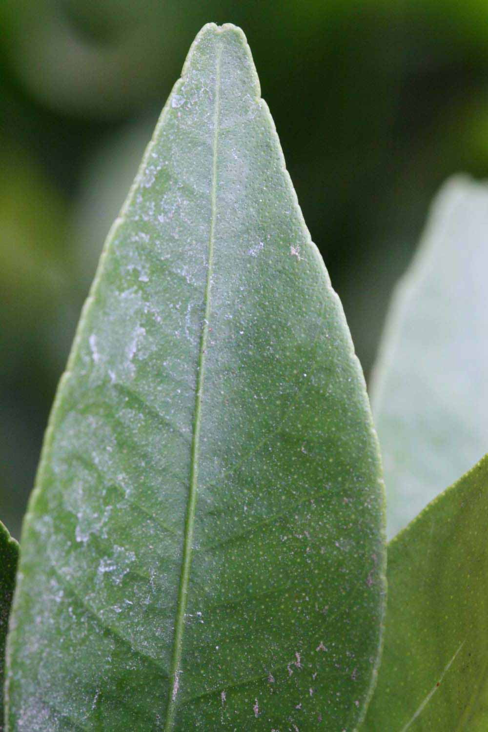 Crown compact or dense, not weeping. First-year twig surface glabrous; second- or third-year twig surface striate; thorns absent or not persistent; prickles absent or not persistent. Petiole glabrous, length short; wings absent, if present, narrow, adjoining the blade. Leaflets one, margin entire (by misinterpretation), crenate/crenulate or bluntly toothed, shade leaflet blades weakly conduplicate, sun leaflet blades weakly or strongly conduplicate. Scent of crushed leaflets mandarin-like. Fruit broader than long; rind yellow (7-10), yellow-orange (11), or orange (12); rind texture slightly rough (4-5) or medium rough (6-7); firmness leathery; navel absent; flesh orange; taste sour.