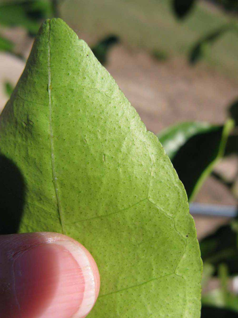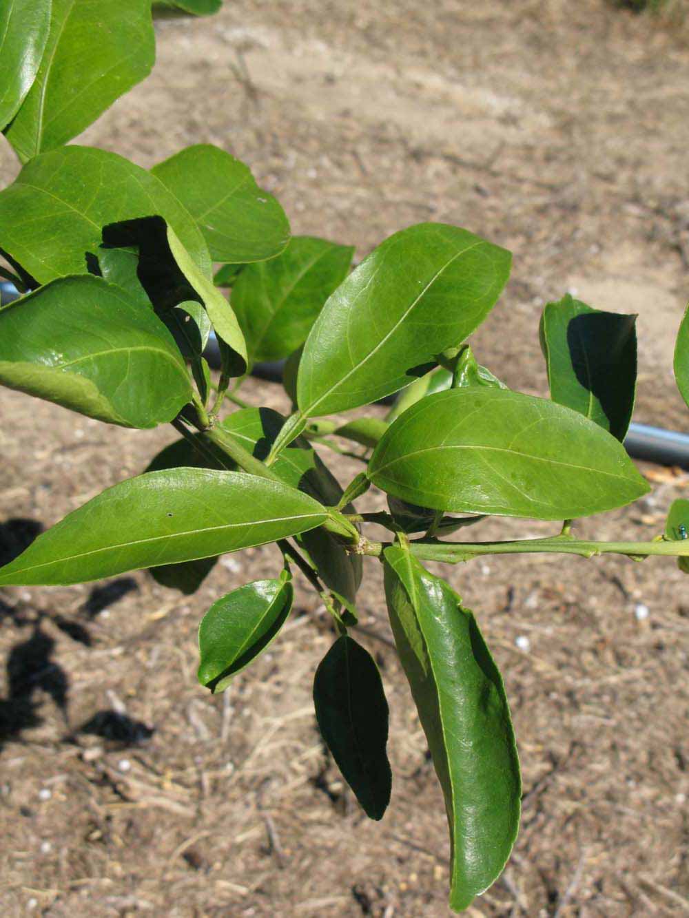 Crown compact or dense, not weeping. First-year twig surface glabrous; second- or third-year twig surface striate; thorns absent or not persistent; prickles absent or not persistent. Petiole glabrous, length medium; wings narrow or medium, adjoining the blade. Leaflets one, margin crenate/crenulate, shade leaflet blades weakly conduplicate, sun leaflet blades weakly or strongly conduplicate. Scent of crushed leaflets mandarin-like when crushed. Fruit as broad as long or longer than broad; rind yellow (7-10), yellow-orange (11), or orange (12); rind texture slightly rough (4-5); firmness leathery; navel absent; flesh orange; taste acidic-sweet.