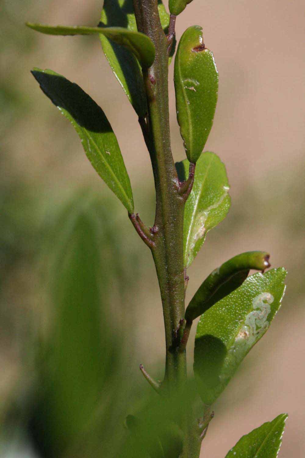 "The leaves are intermediate in shape between the two parent species, but, owing to the enormous number of twigs and consequent great profusion of leaves, they are not intermediate in size between those of the parent species, but nearer that of the small-leaved parent, the finger-lime. The leaf margins are more crenate than those of either parent. The small twigs of both parents are minutely ciliate, but the larger angled twigs, especially of the finger-lime, are almost glabrous. In the hybrid, however, the twigs are more pubescent than those of either parent and are more slender and more upright."