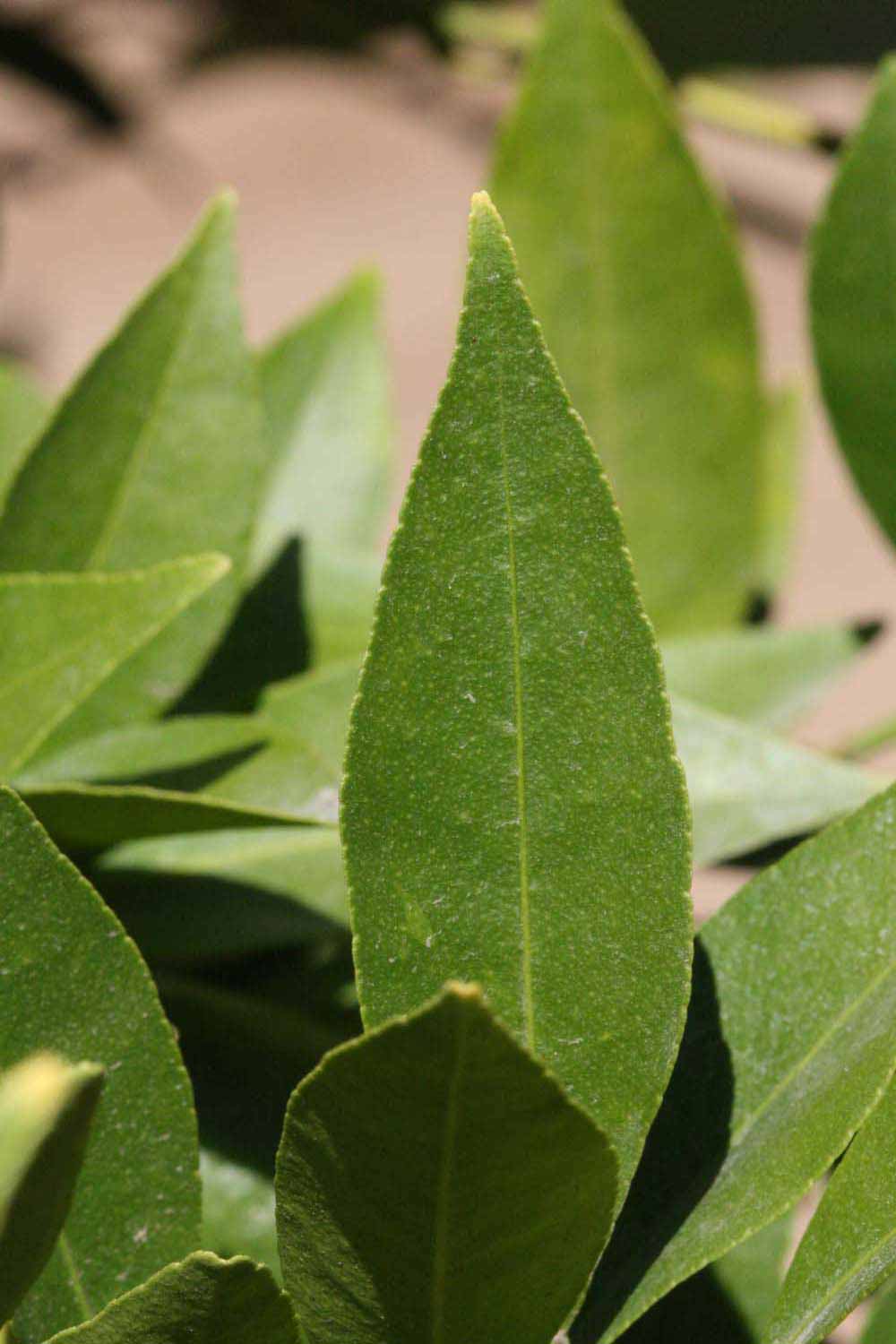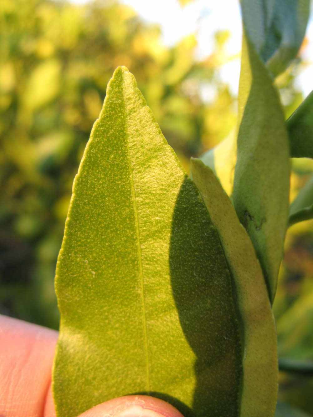 Crown compact or dense, not weeping. First-year twig surface glabrous; second- or third-year twig surface striate; thorns straight; prickles absent or not persistent. Petiole glabrous, length short; wings absent. Leaflets one, margin bluntly toothed or serrate/serrulate, shade leaflet blades flat or weakly conduplicate, sun leaflet blades weakly conduplicate. Scent of crushed leaflets freshly lemon-like. Fruit as broad as long or longer than broad; rind light green with some break to yellow (5), green-yellow (6), yellow (7-10), or yellow-orange (11); rind texture smooth (1-3) or slightly rough (4-5); firmness leathery; navel absent; flesh yellow; taste sour.