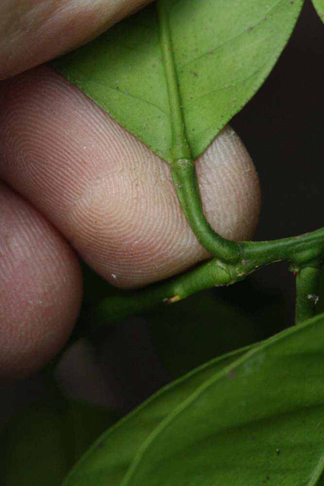 Crown compact or dense, not weeping. First -year twig surface glabrous; second- or third-year twig surface striate; thorns absent or not persistent; prickles absent or not persistent. Petiole glabrous, length medium; wings narrow, adjoining the blade. Leaflets one, margin bluntly toothed, shade leaflet blades weakly conduplicate, sun leaflet blades weakly conduplicate. Scent of crushed leaflets mandarin-like. Fruit as broad as long or longer than broad; rind yellow (7-10), yellow-orange (11), orange (12), or red-orange (13); rind texture slightly rough (4-5) or medium rough (6-7); firmness leathery; navel absent; flesh orange; taste acidic-sweet.