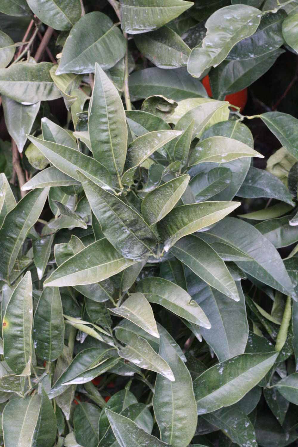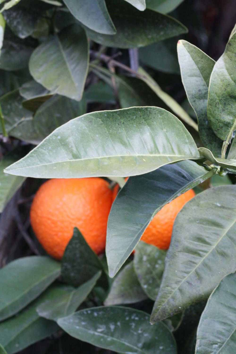 Crown compact or dense, not weeping. First-year twig surface glabrous; second- or third-year twig surface striate; thorns absent or not persistent; prickles absent or not persistent. Petiole glabrous, length short; wings narrow, adjoining the blade. Leaflets one, margin bluntly toothed, shade leaflet blades weakly conduplicate, sun leaflet blades weakly conduplicate. Scent of crushed leaflets sweetly orange-like, spicy or peppery, mandarin-like, rarely not scented. Fruit as broad as long or longer than broad; rind orange (12) or red-orange (13); rind texture slightly rough (4-5); firmness leathery; navel absent; flesh orange; taste acidic-sweet, sour, rarely acidless-sweet.