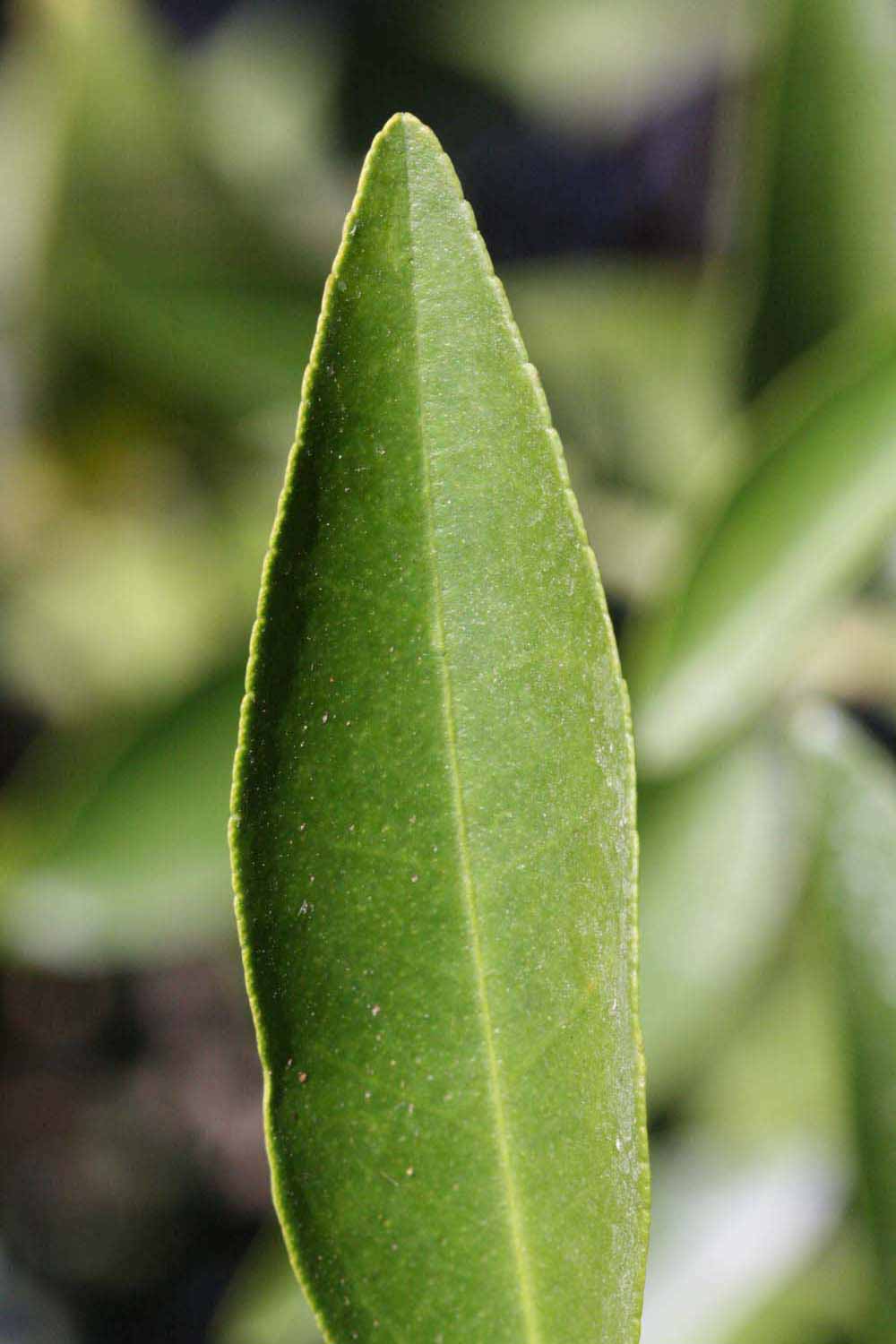 Crown compact or dense, not weeping. First-year twig surface glabrous; second- or third-year twig surface striate; thorns straight; prickles absent or not persistent. Petiole glabrous, length medium; wings absent or, if present, wide, adjoining the blade or tucking beneath blade. Leaflets one, margin crenate/crenulate or bluntly toothed, shade leaflet blades weakly conduplicate, sun leaflet blades weakly conduplicate. Scent of crushed leaflets sweetly orange-like. Fruit as broad as long or longer than broad; rind yellow (7-10), yellow-orange (11), orange (12), or red-orange (13); rind texture slightly rough (4-5); firmness leathery; navel absent; flesh orange; taste sour.